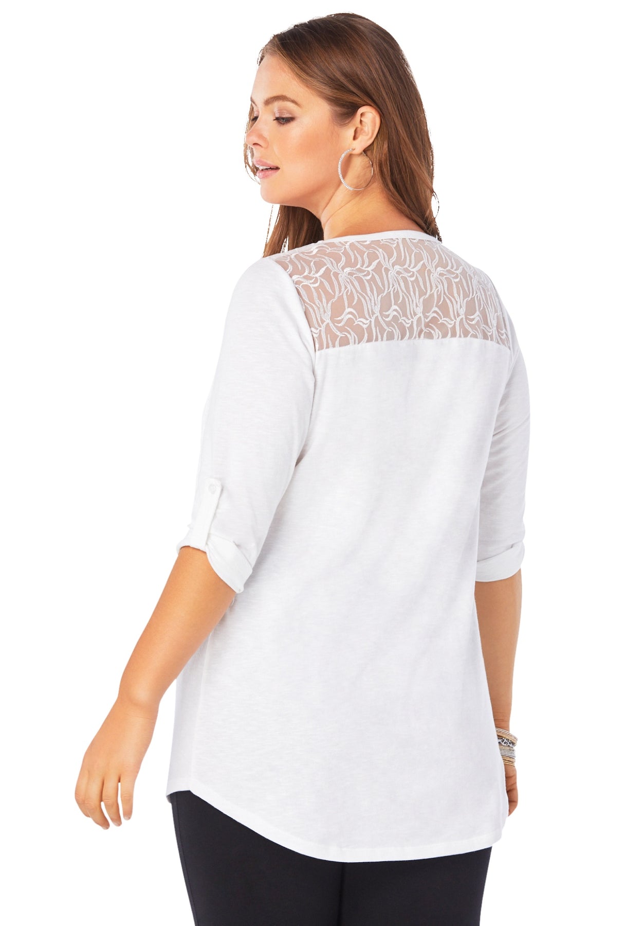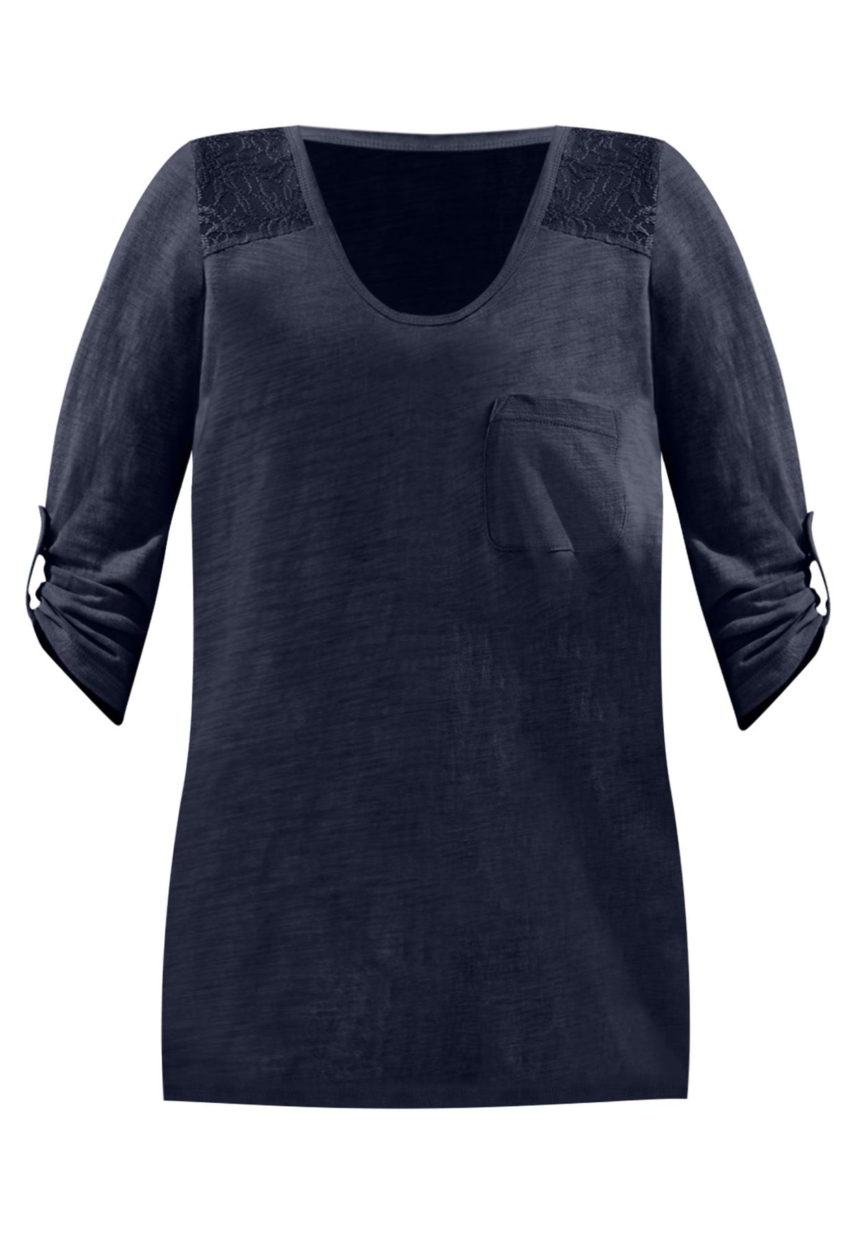 Lovely lace adorns the front and back shoulders of this great-fitting tunic. A-line silhouette. Left chest pocket. Three-quarter sleeves with roll tabs.