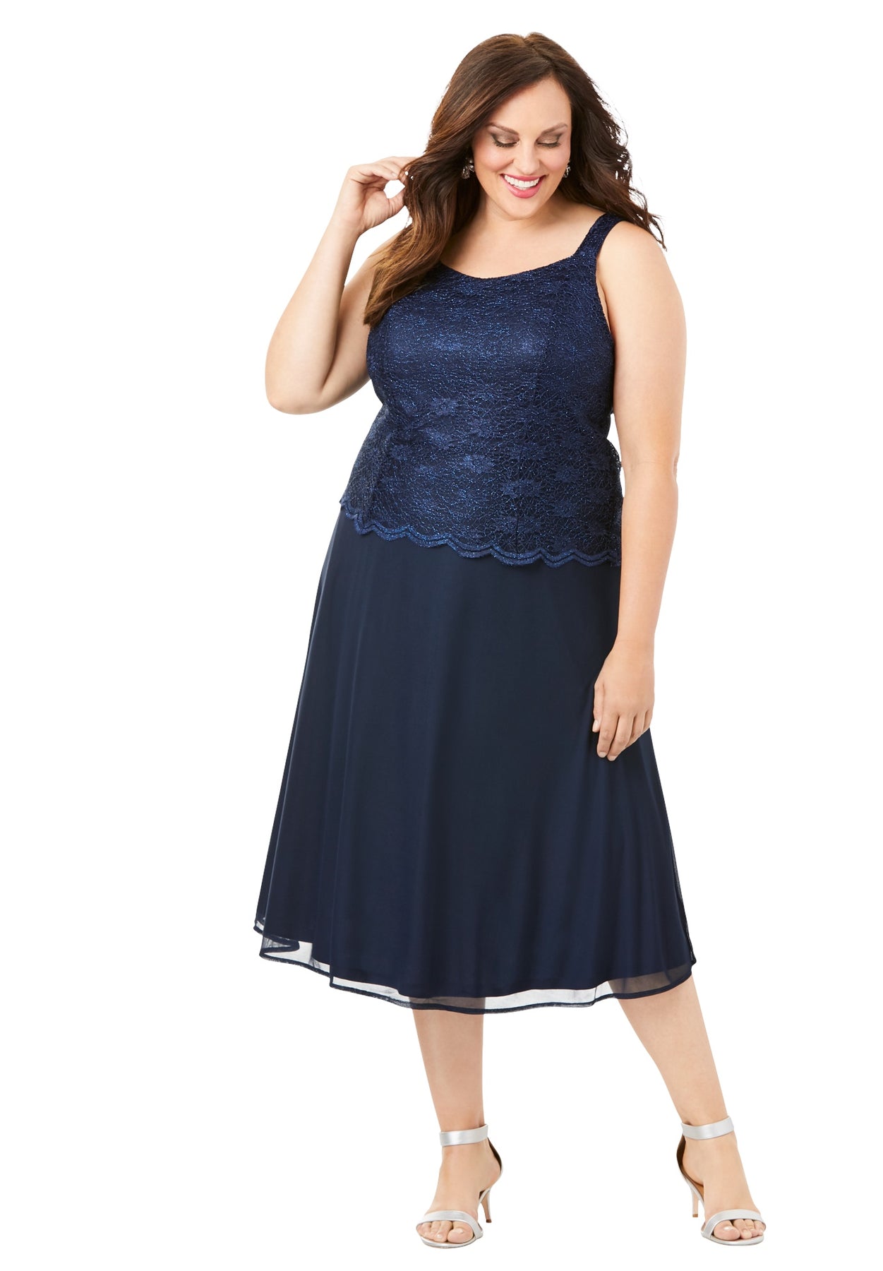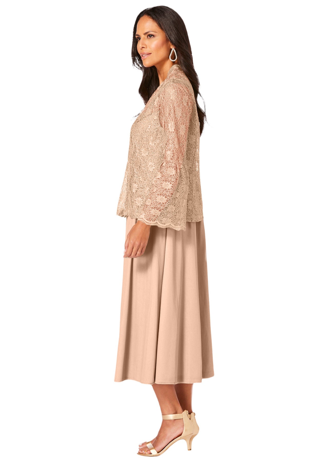 A lovely, two-piece set with a glittery, metallic shine. The jacket is crafted in all-over lace and features bracelet-length bell sleeves and scallop edges. The tank dress is lined with knit for ease of movement and has wide straps to comfortably conceal undergarments. Perfect for dancing the night away. Center-back zip.