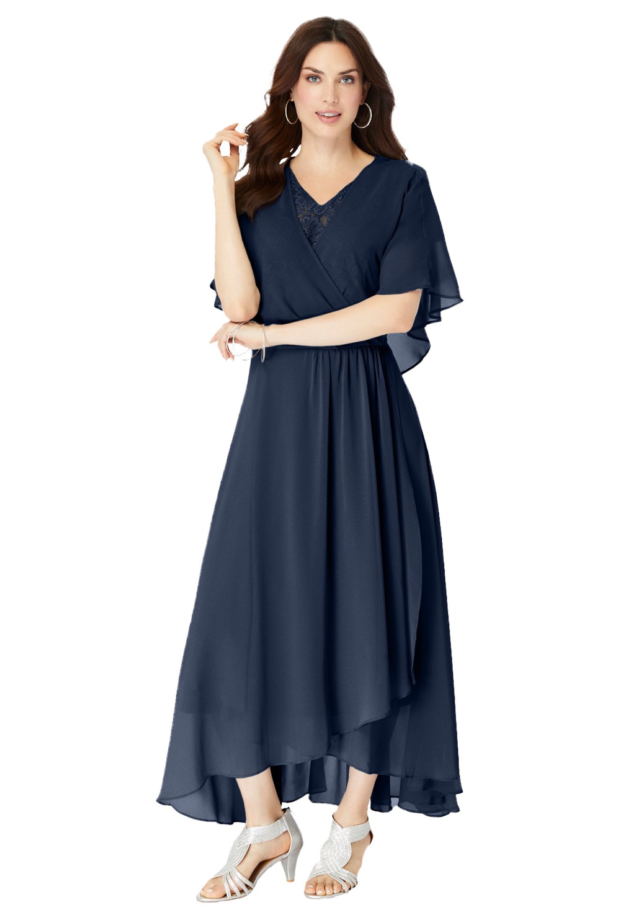 Light up the room at your next special event with our stunning chiffon faux wrap dress. Layers of chiffon drape a surplice lace top to create an alluring gown. Airy capelet sleeves and a high-low hem add a final flourish. Fit-and-flare silhouette. Faux wrap skirt with tricot lining.