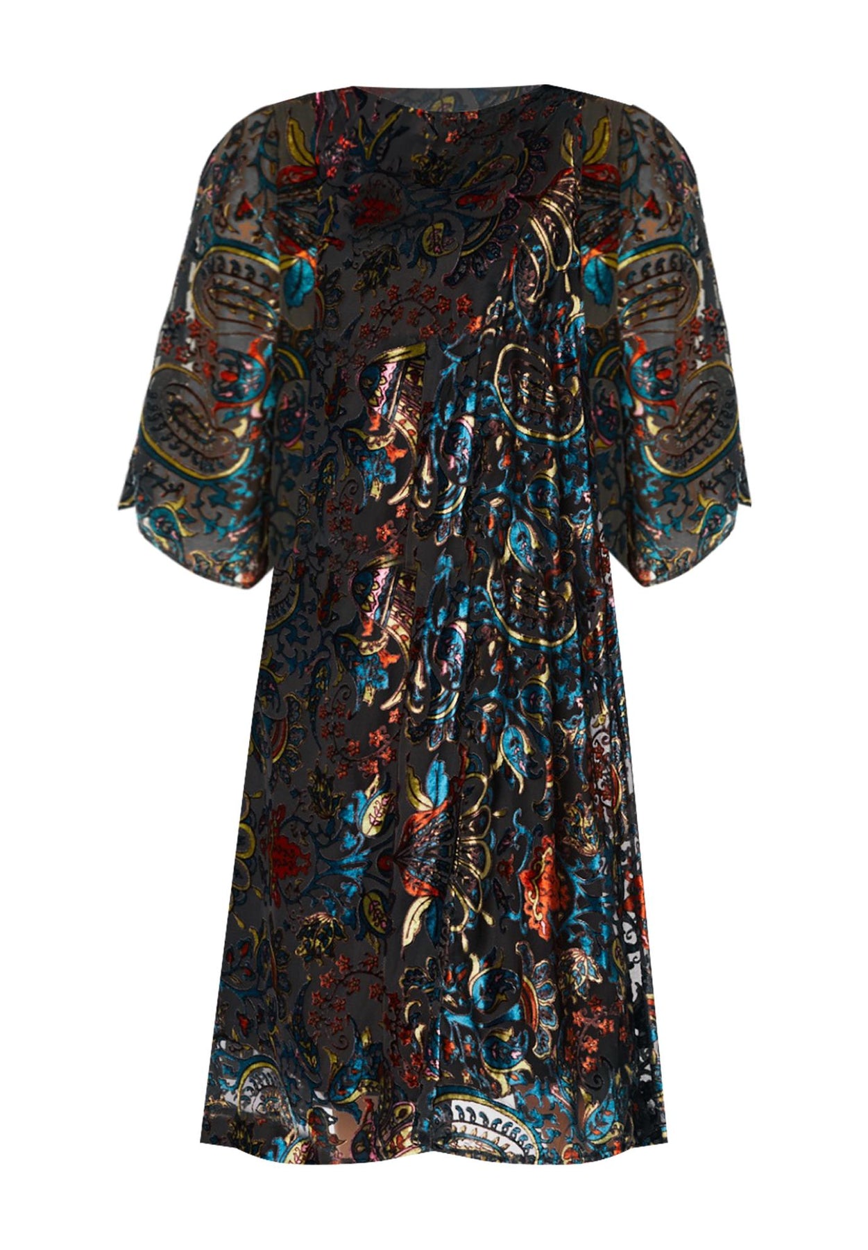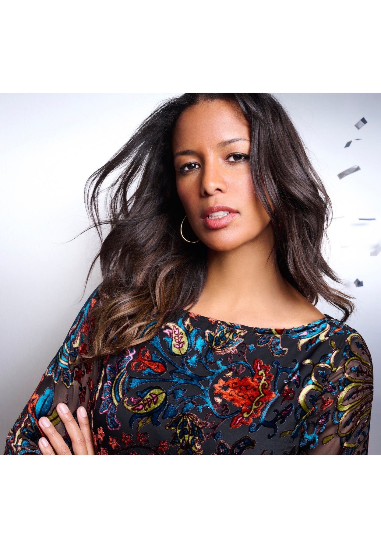 Elegant flowy pieces made from burnout velvet make for a radiant look from every angle in this sultry boatneck swing dress, with gauzy three-quarter length sleeves and a concealed back zipper. Lined at the body.
