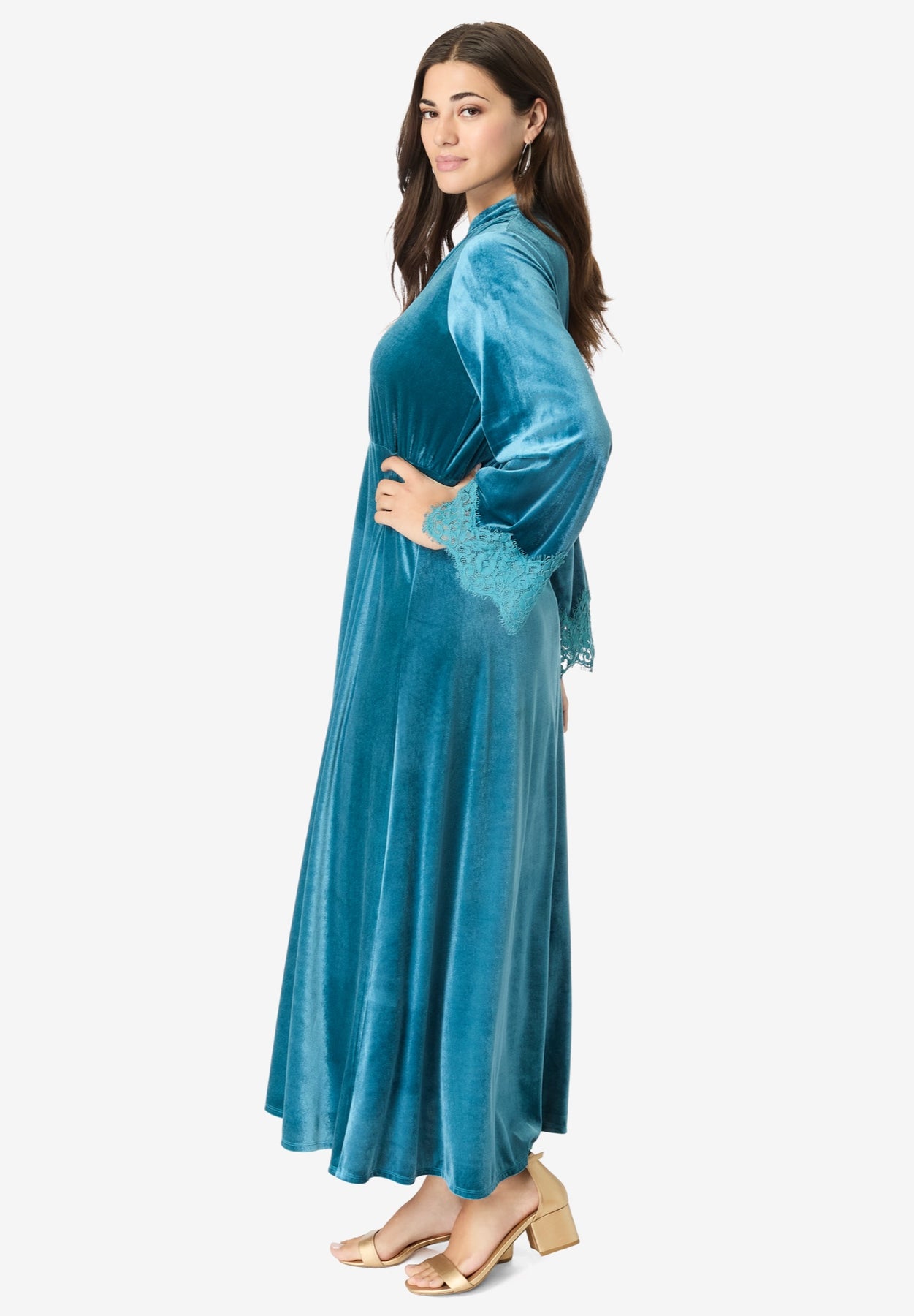 Elevate your wardrobe with this stunning velour maxi dress featuring a sophisticated blend of classic and modern style. With a V-neckline and mandarin collar, this touchable dress features long sleeves adorned with delicate scallop lace trim. Shirring at the waist and shoulders creates a flattering fit, while the A-line silhouette ensures a timeless, elegant look. Finished with a convenient zipper closure at the back.