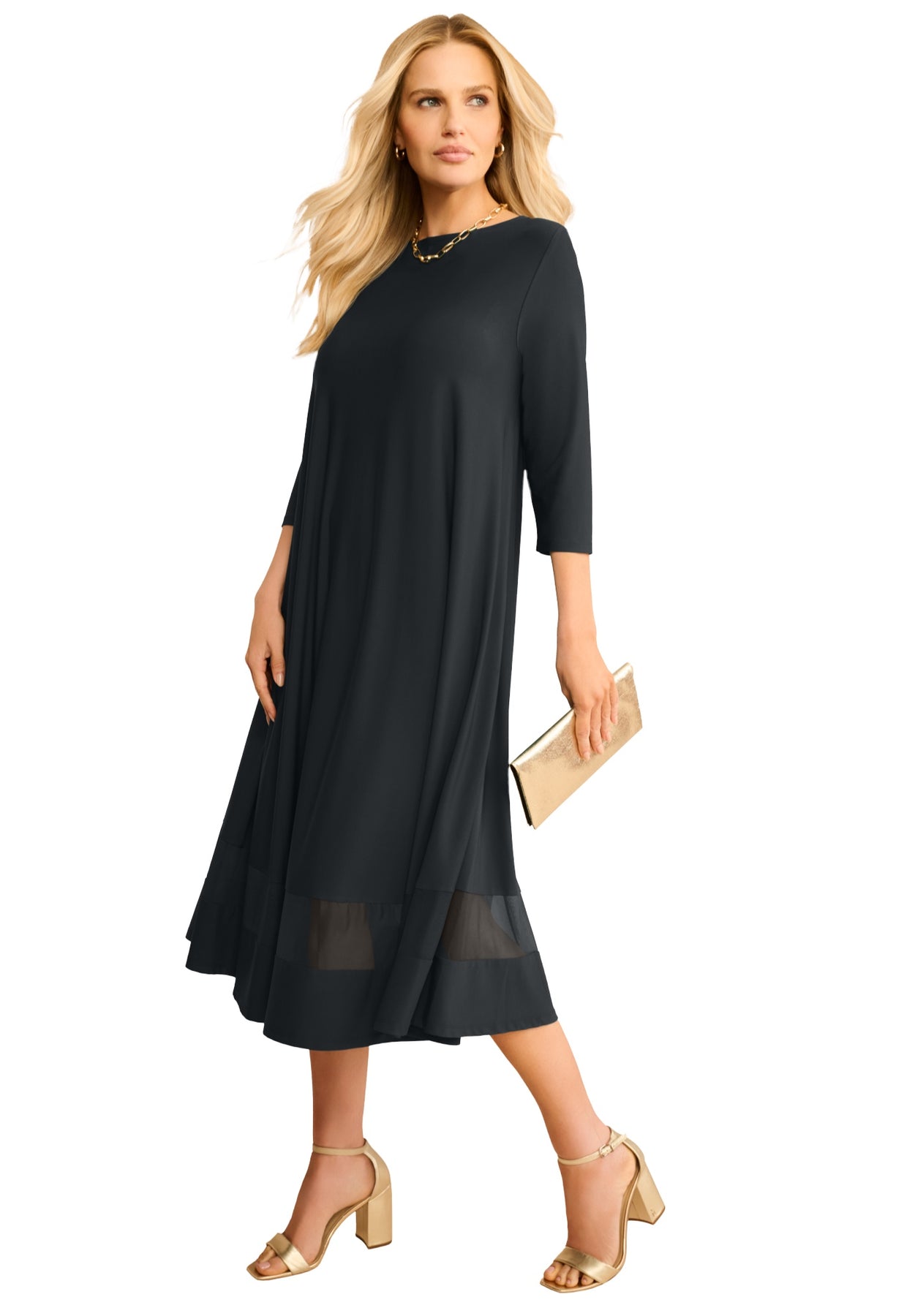 This boatneck swing dress features sheer mesh inserts along the neckline, three-quarter sleeves, and hem for a subtle, stylish reveal. With its easy-fitting trapeze shape and curved shirttail hem, slip on a pair of flats for a breezy daytime vibe or elevate with heels and a cuff bracelet.