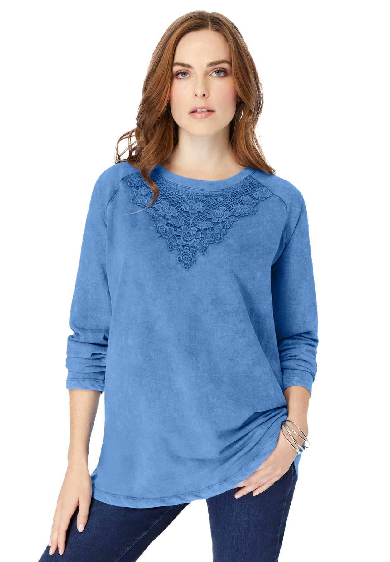 Embrace an updated version of acid wash in this crewneck sweatshirt decorated with lovely lace appliqué. Acid wash treatment makes each piece unique, resulting in a worn-in look that is exclusively yours. Raglan long sleeves add to the causal appeal of this top, making it a forever favorite.
