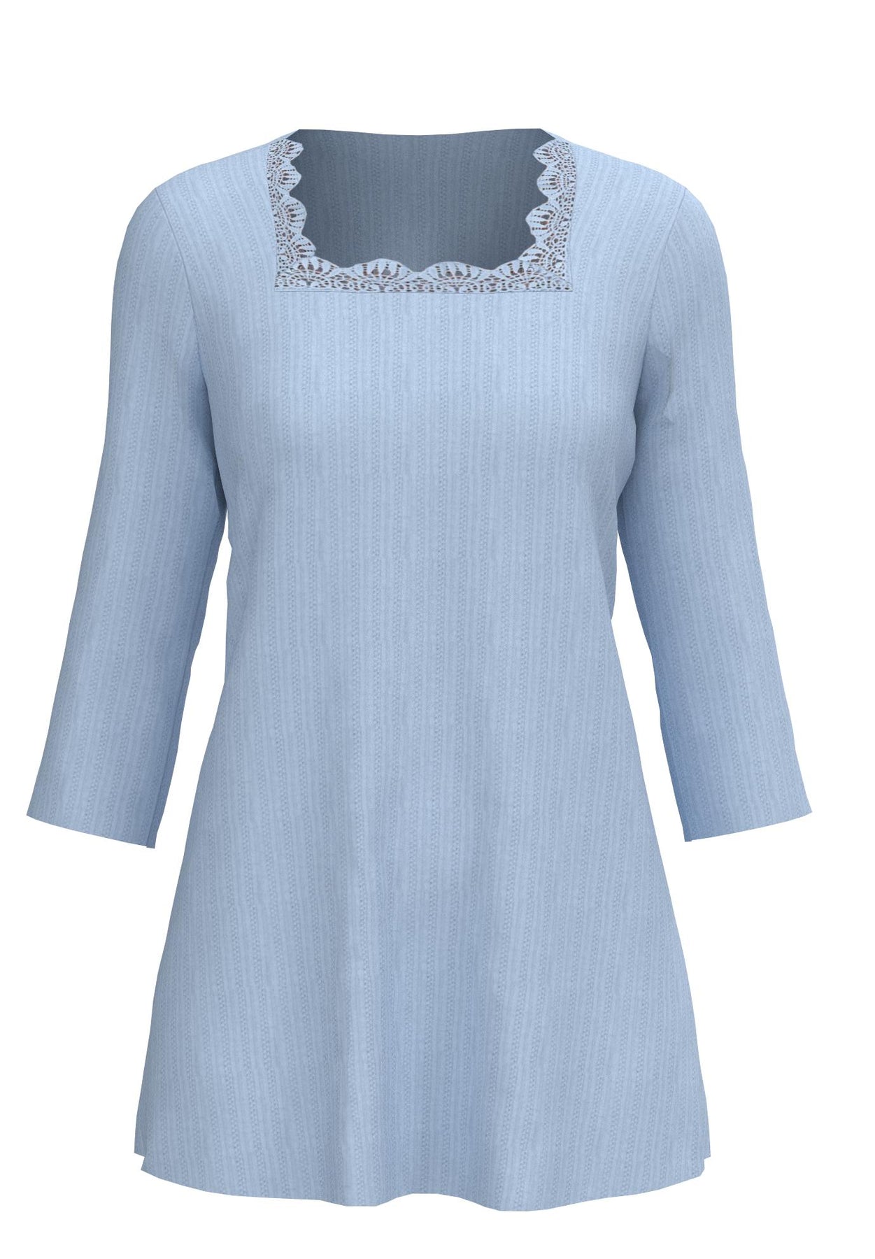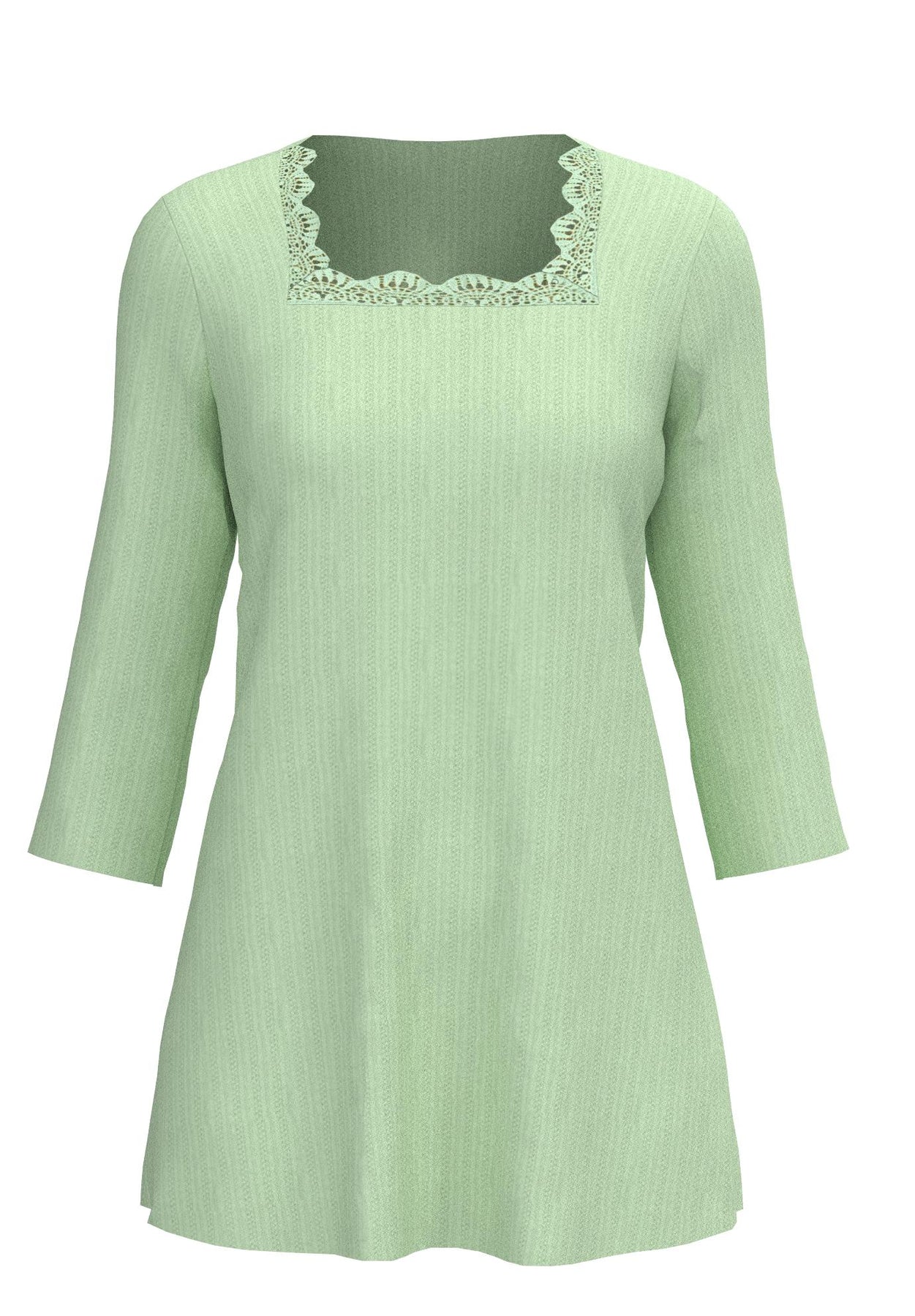 Featuring scallop lace trim along its squareneck design, enjoy the dedication to the details with this pointelle top. An A-line silhouette, three-quarter sleeves, and shirttail hem create a flowy top that looks great untucked over a pair of trousers or jeans.