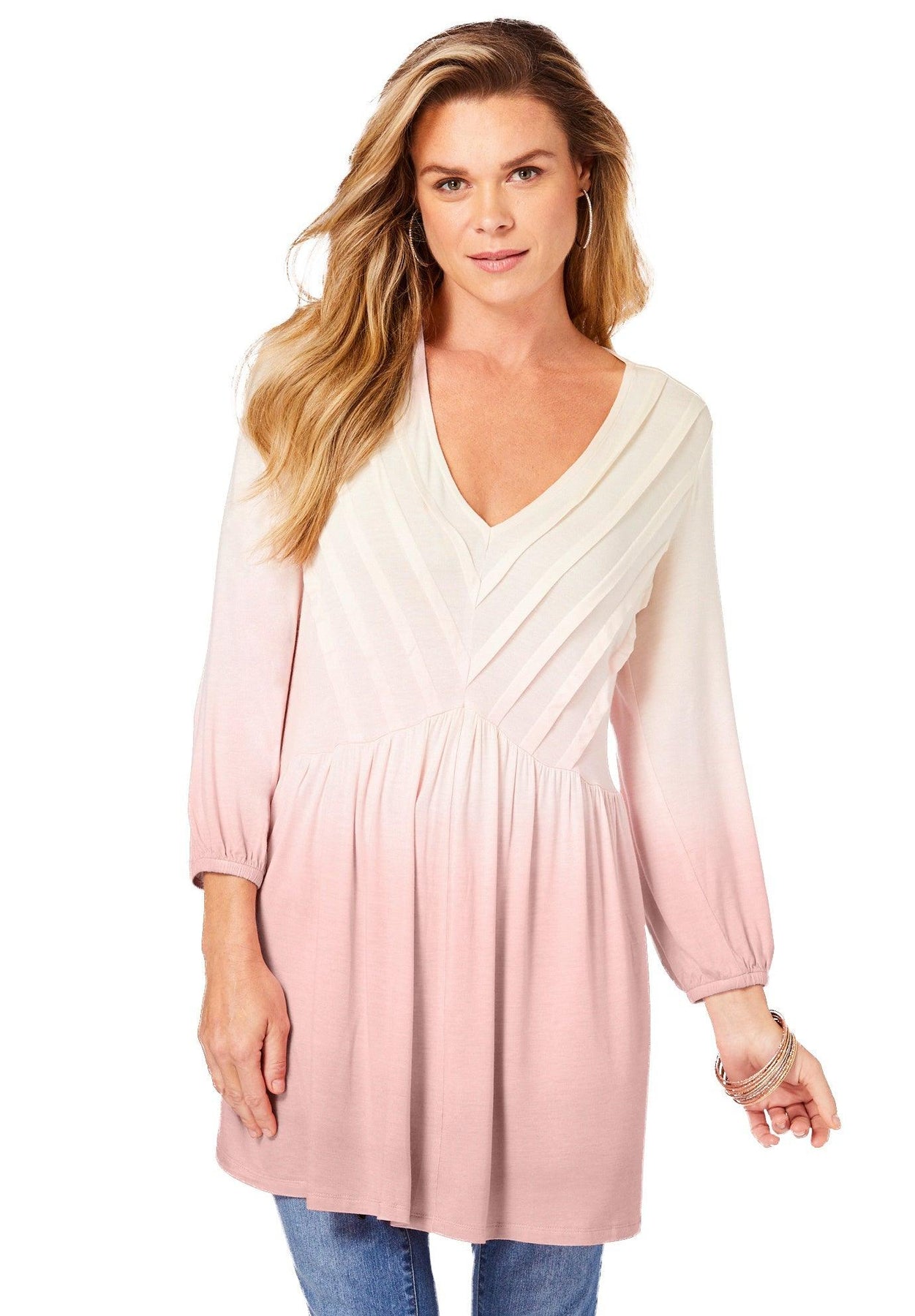 Gradient shading and a flowy, fit-and-flare silhouette make this top not only a standout, but perfect for just about any occasion. Pleated V-neck with shirred empire waist and three-quarter blouson sleeves. Fit-and-flare silhouette.