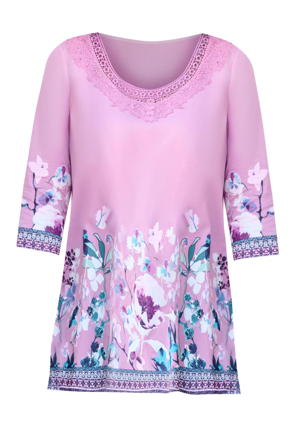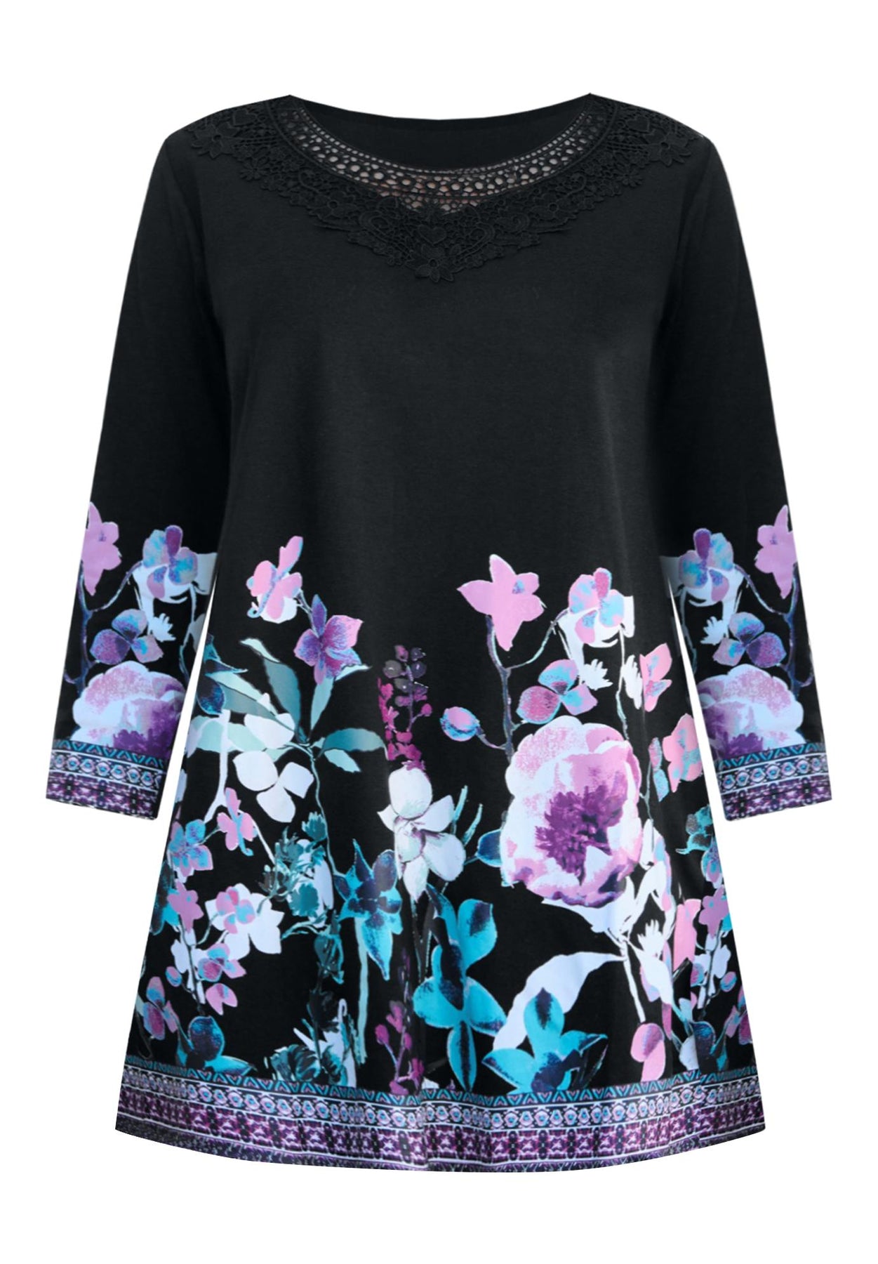 Feminine and fanciful, this lace-detailed scoop-neck style is crafted with paisley print at the three-quarter sleeves and hem and a swingy a-line silhouette.
