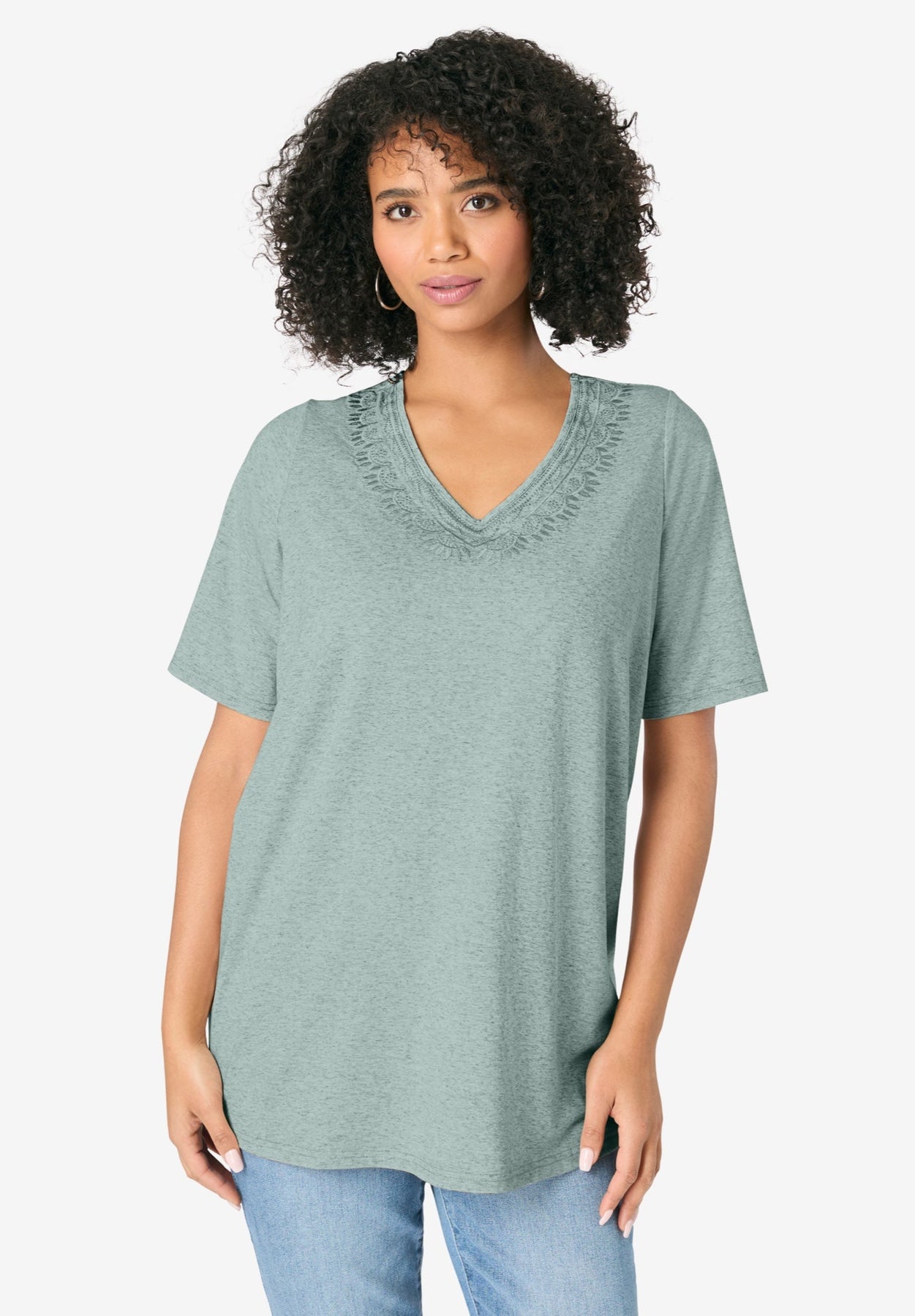 With an embroidered V-neckline and a relaxed silhouette, this tee is a versatile piece that blends comfort and style seamlessly. It's infused with linen for even more breathability during those warm months, and perfect for layering.
