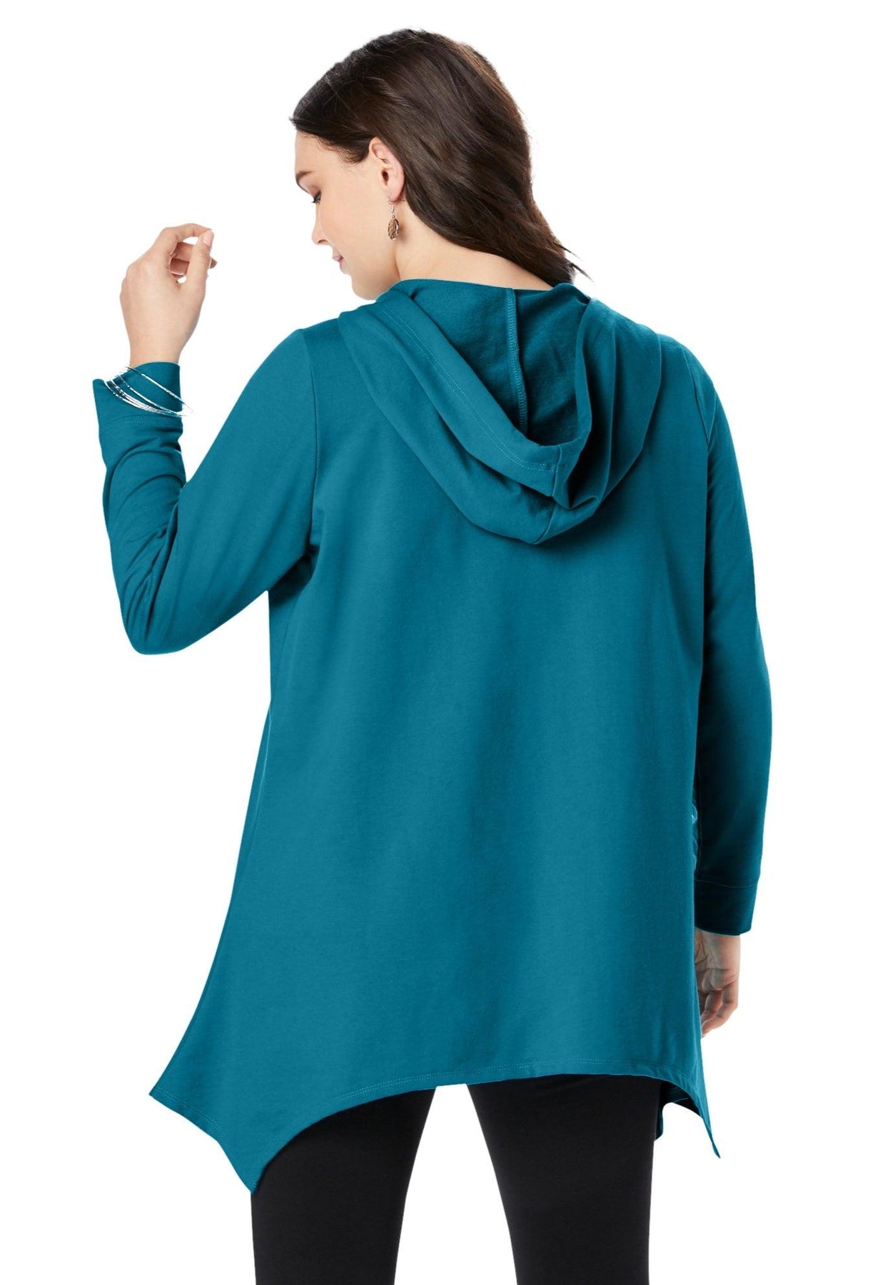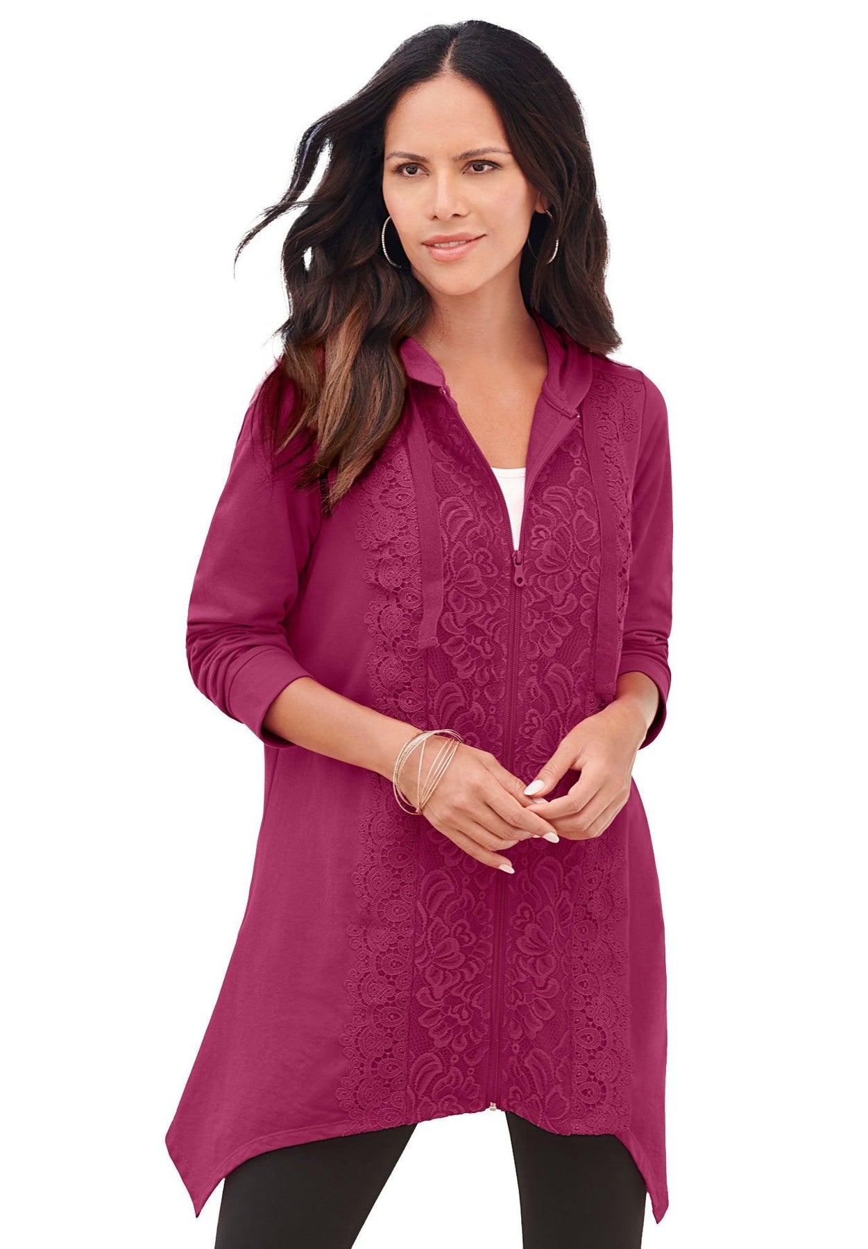 We added fun touches to an everyday hooded sweatshirt with pretty lace panels, scallop trim and an easy zip-front design. Layer it over your favorite tee and leggings for a relaxed and feminine look. Side slits.