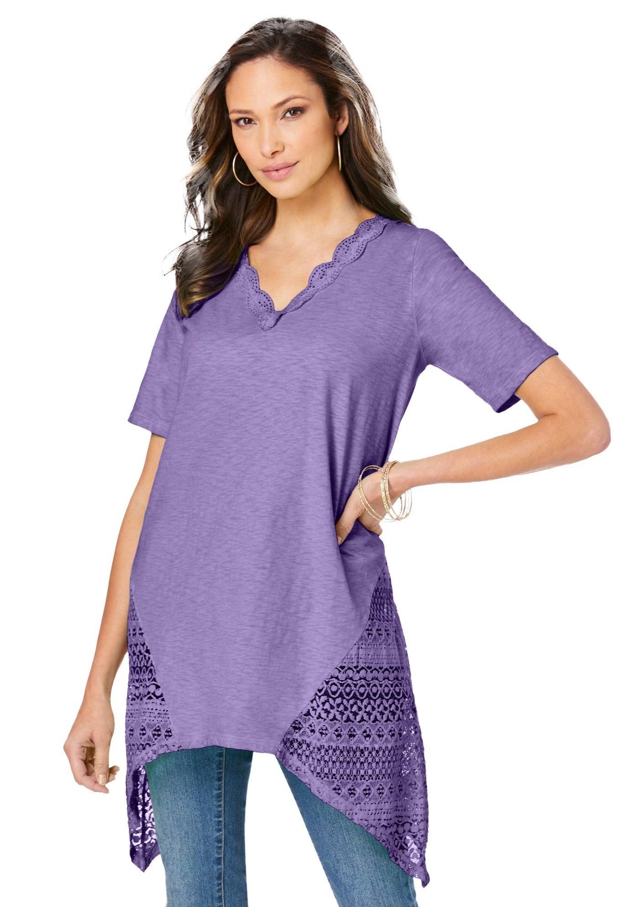 Delicate lace at the V-neckline and hem adds modern dimension to this eye-catching style with godet insets at the sides. Handkerchief hem, a-line silhouette.
