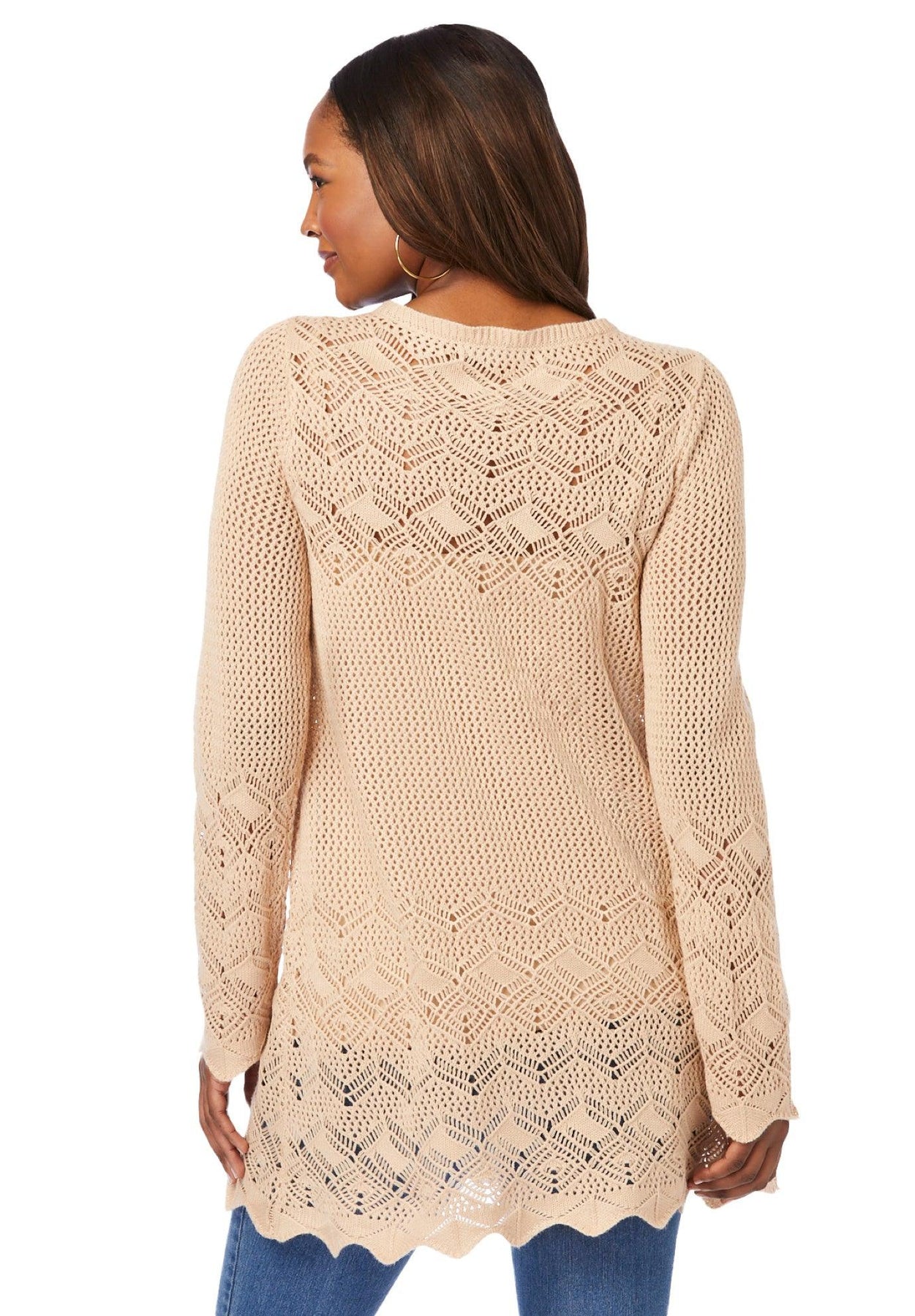Openwork pointelle steals the show in this V-neck style with lace trim and scalloped sleeves and hem.