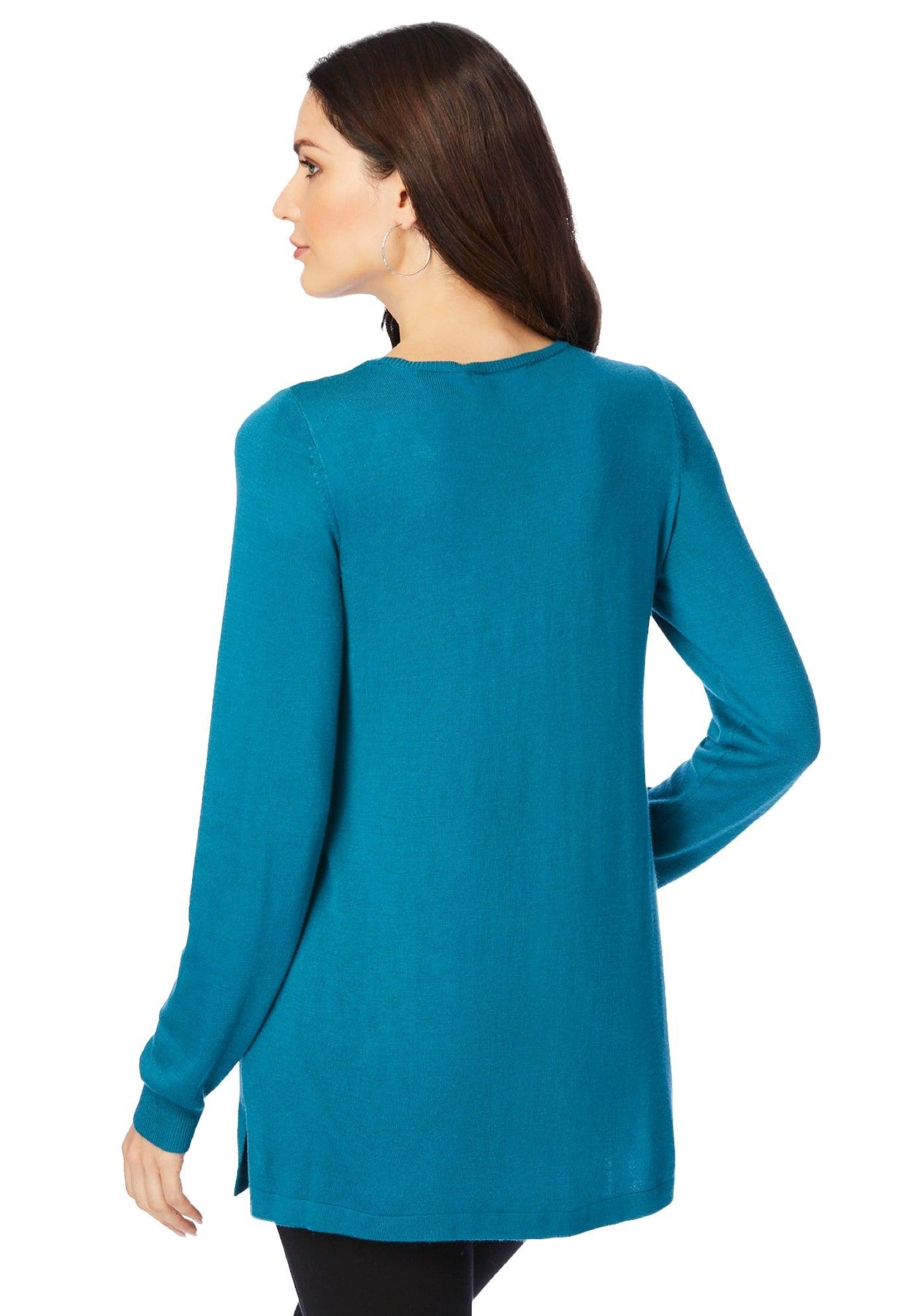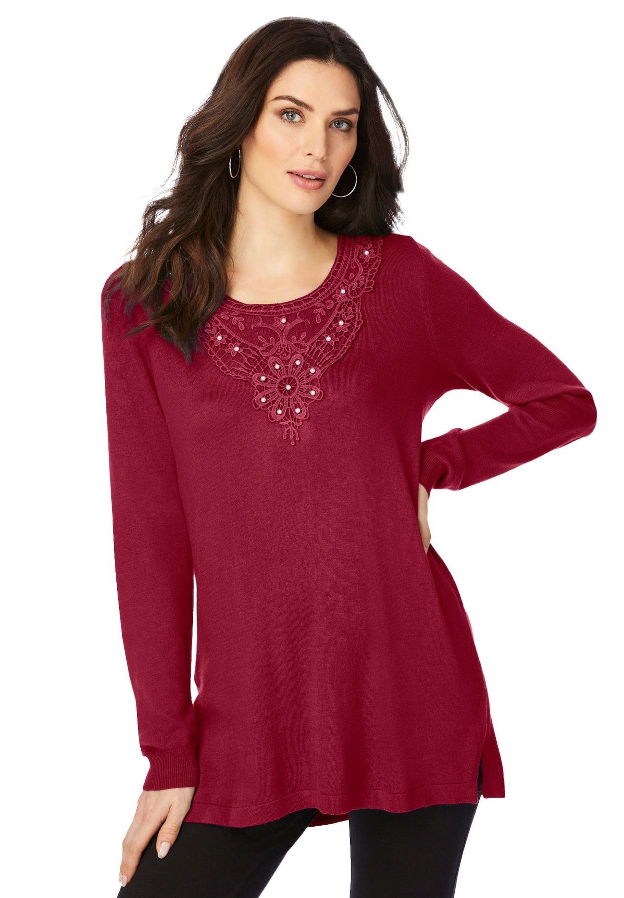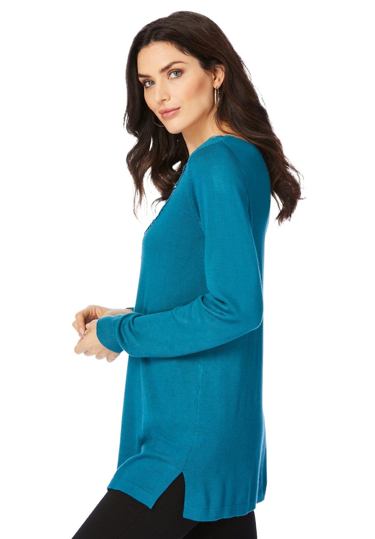 Romance is in the air with this scoop neck sweater featuring pearlized details and ribbed cuffs. Side slits, ribbed hem.