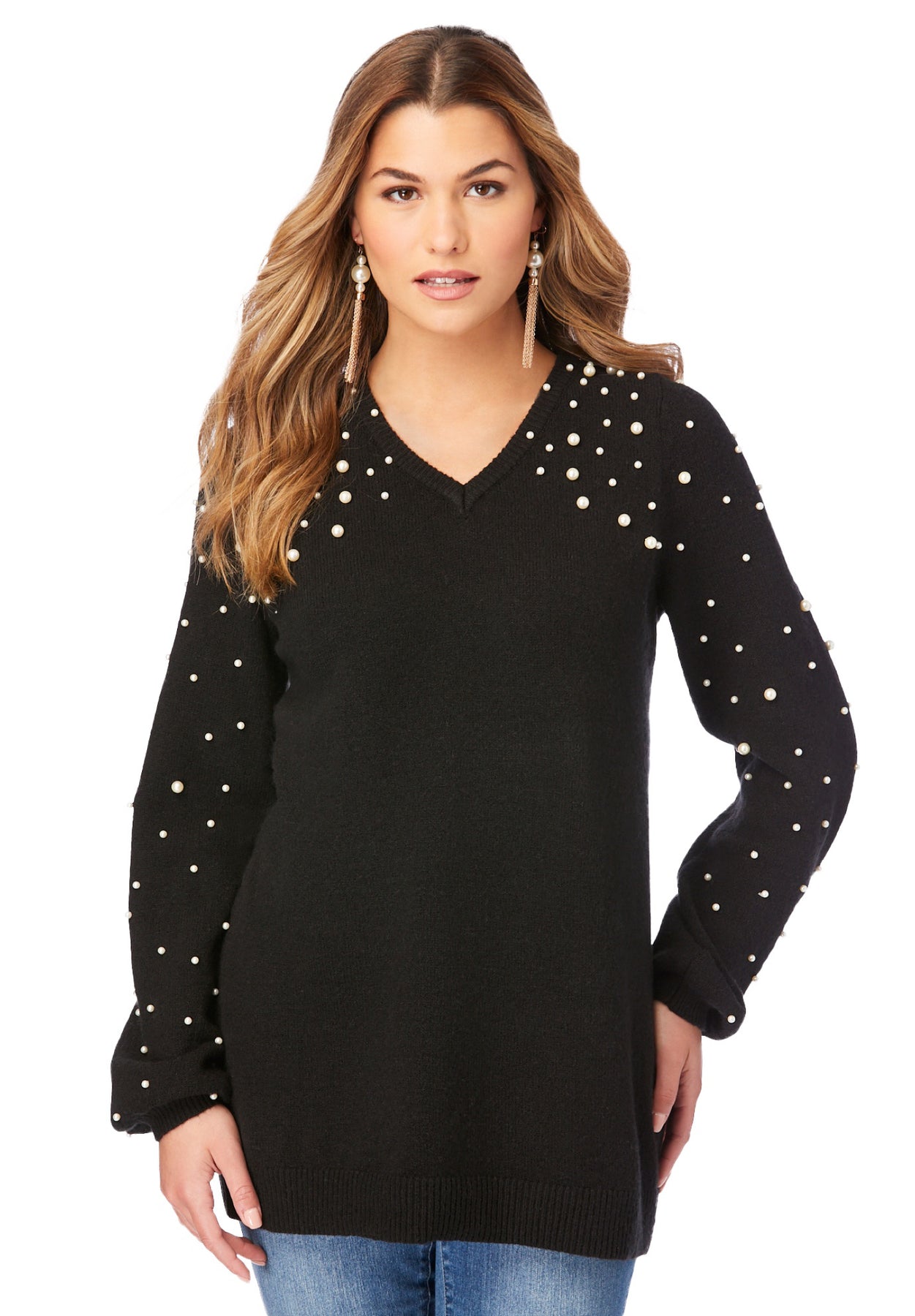 Take your wardrobe to a stylish new level with this V-neck sweater, featuring glam embellishments like sequins and pearls and blouson sleeves. A classic shape with a contemporary feel, the perfect transition piece for cooler months. Embellishment design varies by color.