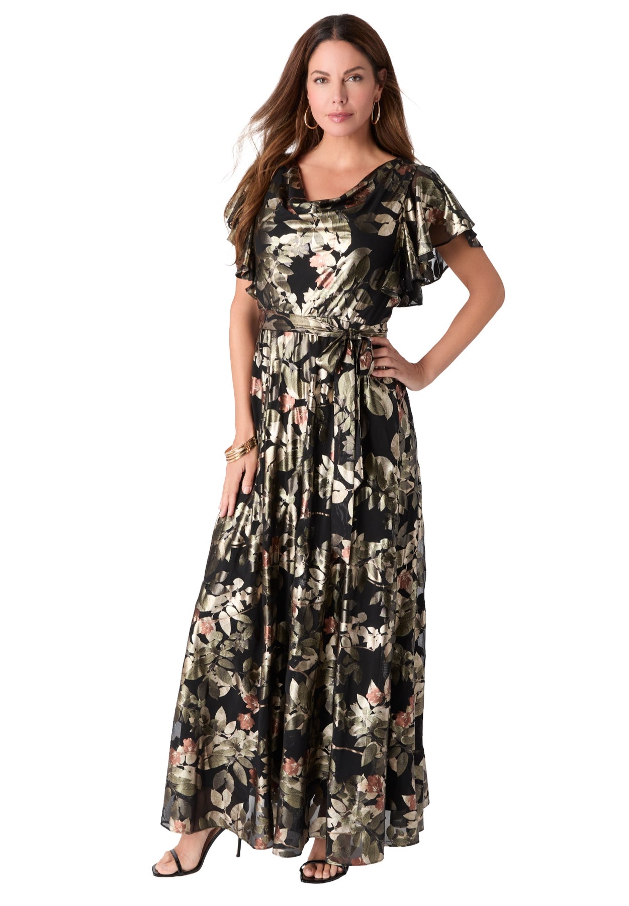 Light up a room in our Foil Print Mesh Dress, featuring a graceful pleated cowl neck, ruffled short sleeves and a figure-loving shirred elastic waistband with a self-tie belt for adjustable comfort. Style this maxi-length dress with metallic sandals and a clutch for a polished look that moves from dinner to dancing with ease. Invisible back zipper. Fully lined.