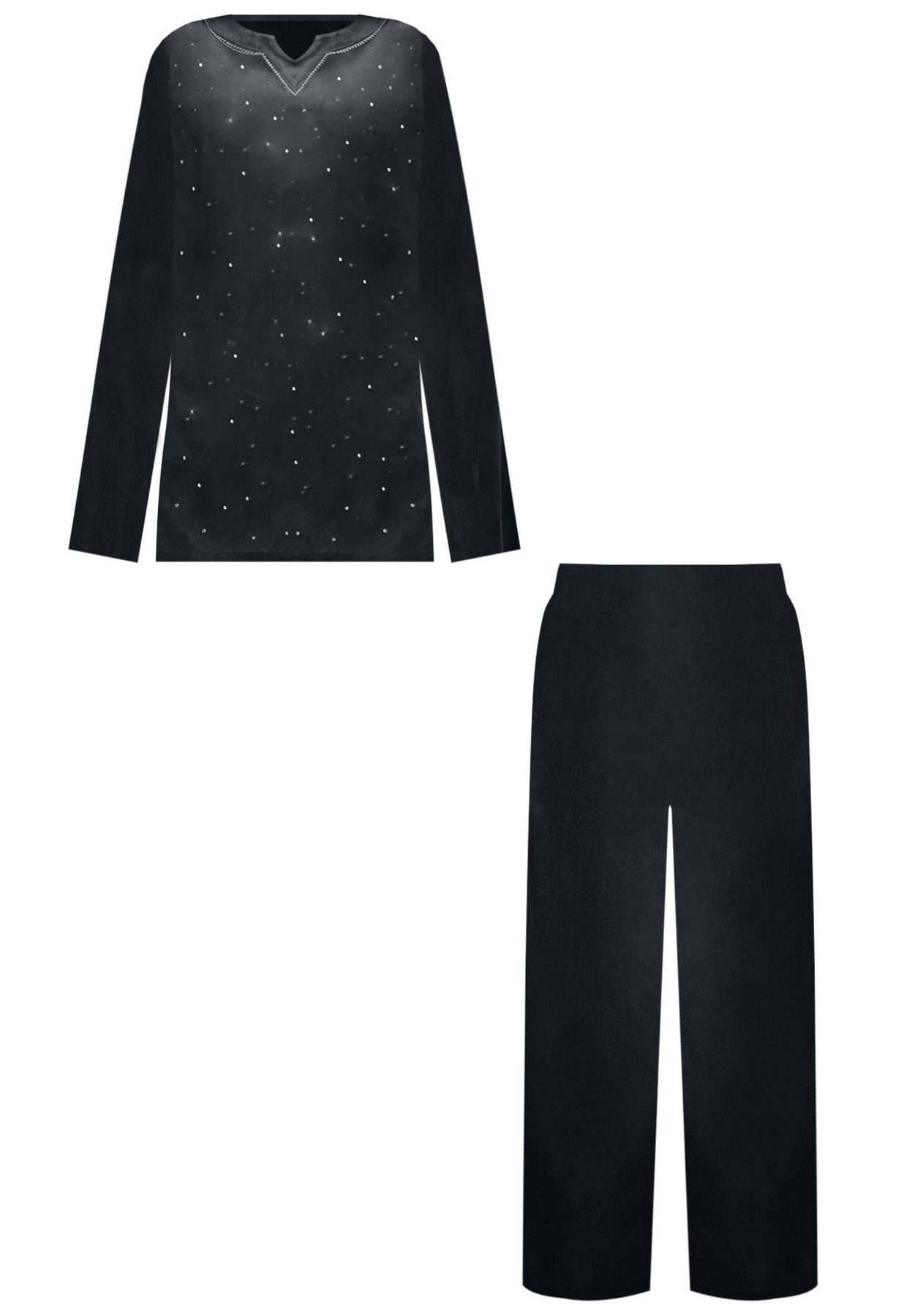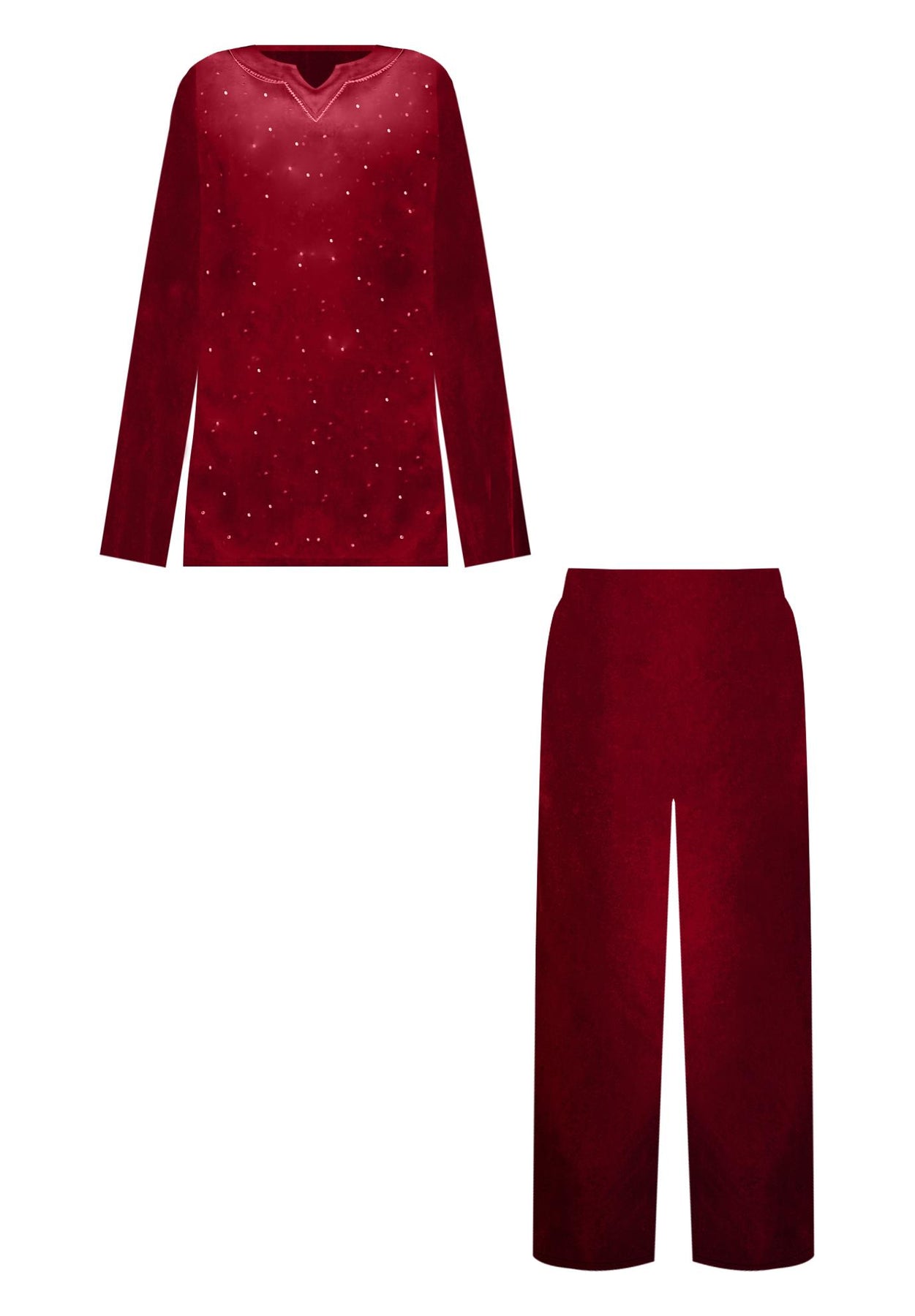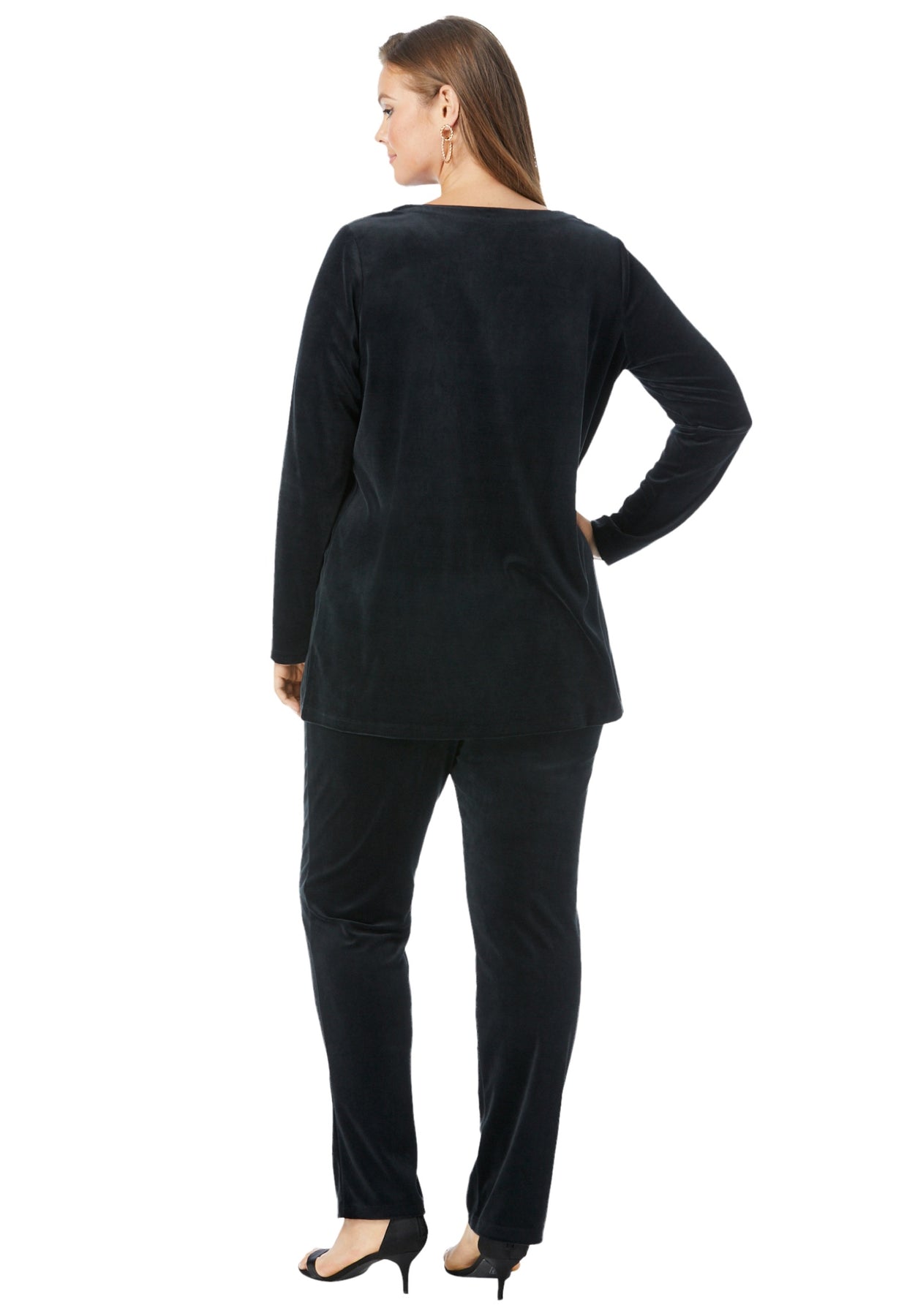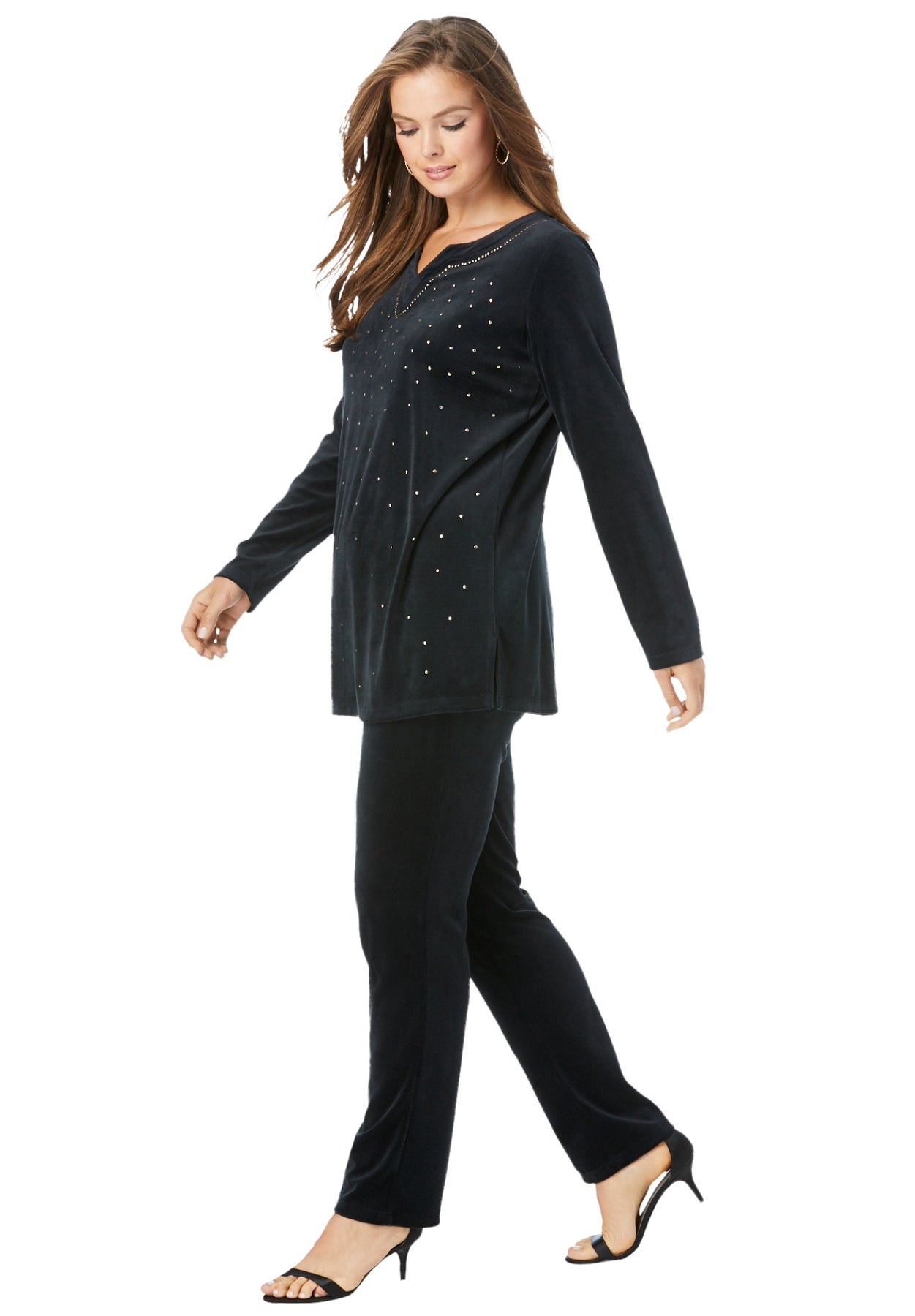 With this look comfort meets glam, the notch-neck tunic is embellished with beautiful gold detailing and the matching pants create a pulled-together look. Elasticized straight-leg pant.