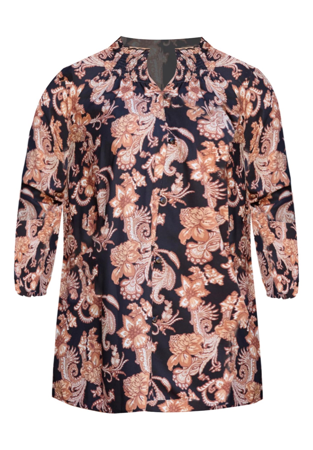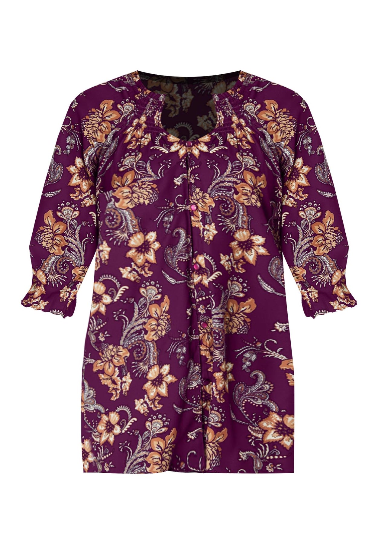 Channel the most beautiful bohemian vibes in this breezy blouse with smocking and ruffle detailing at the notch neckline. Features a button-down front for a classic blouse look. Three-quarter length blouson sleeves finished with an elastic hem add a dose of volume to the versatile top.