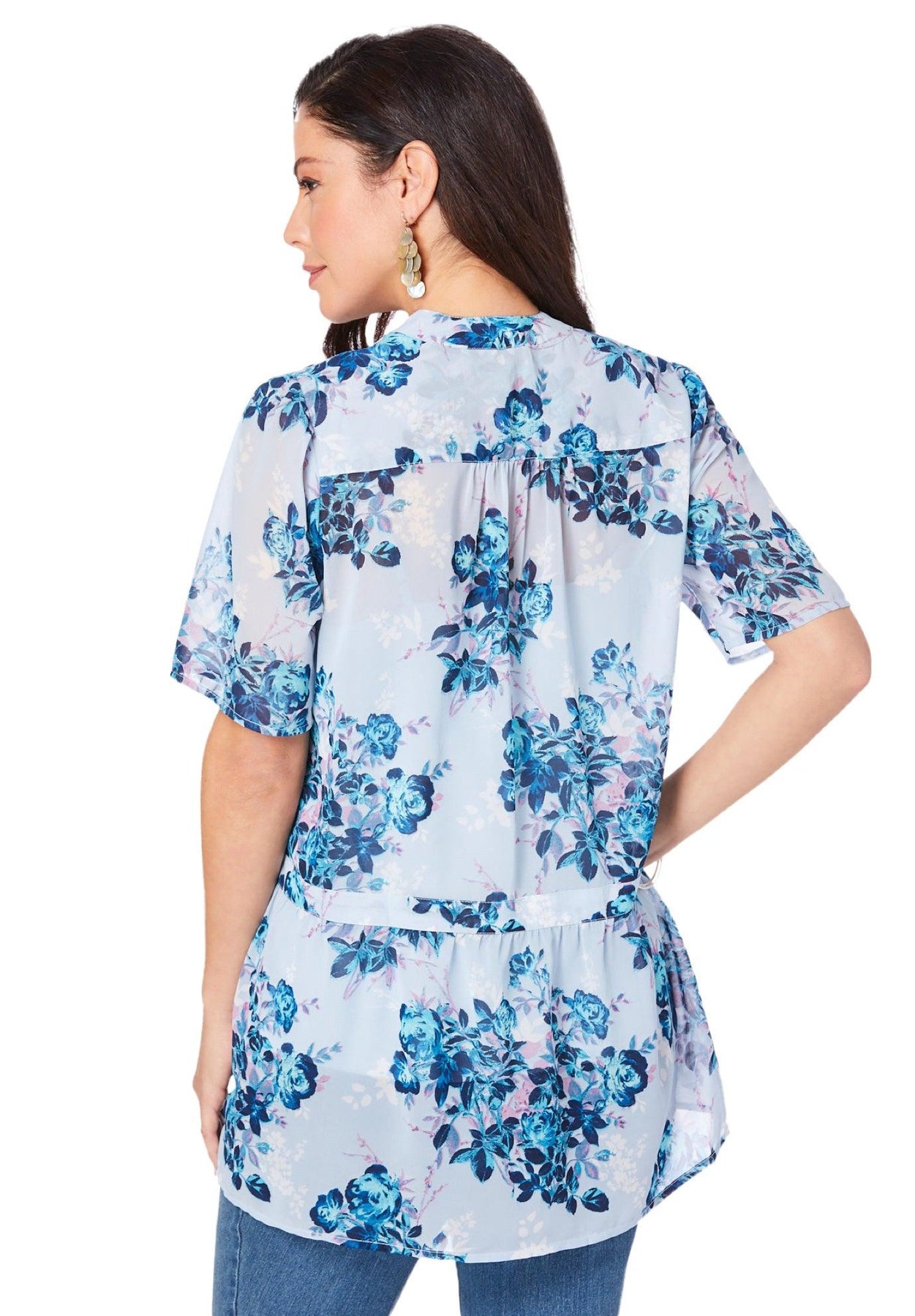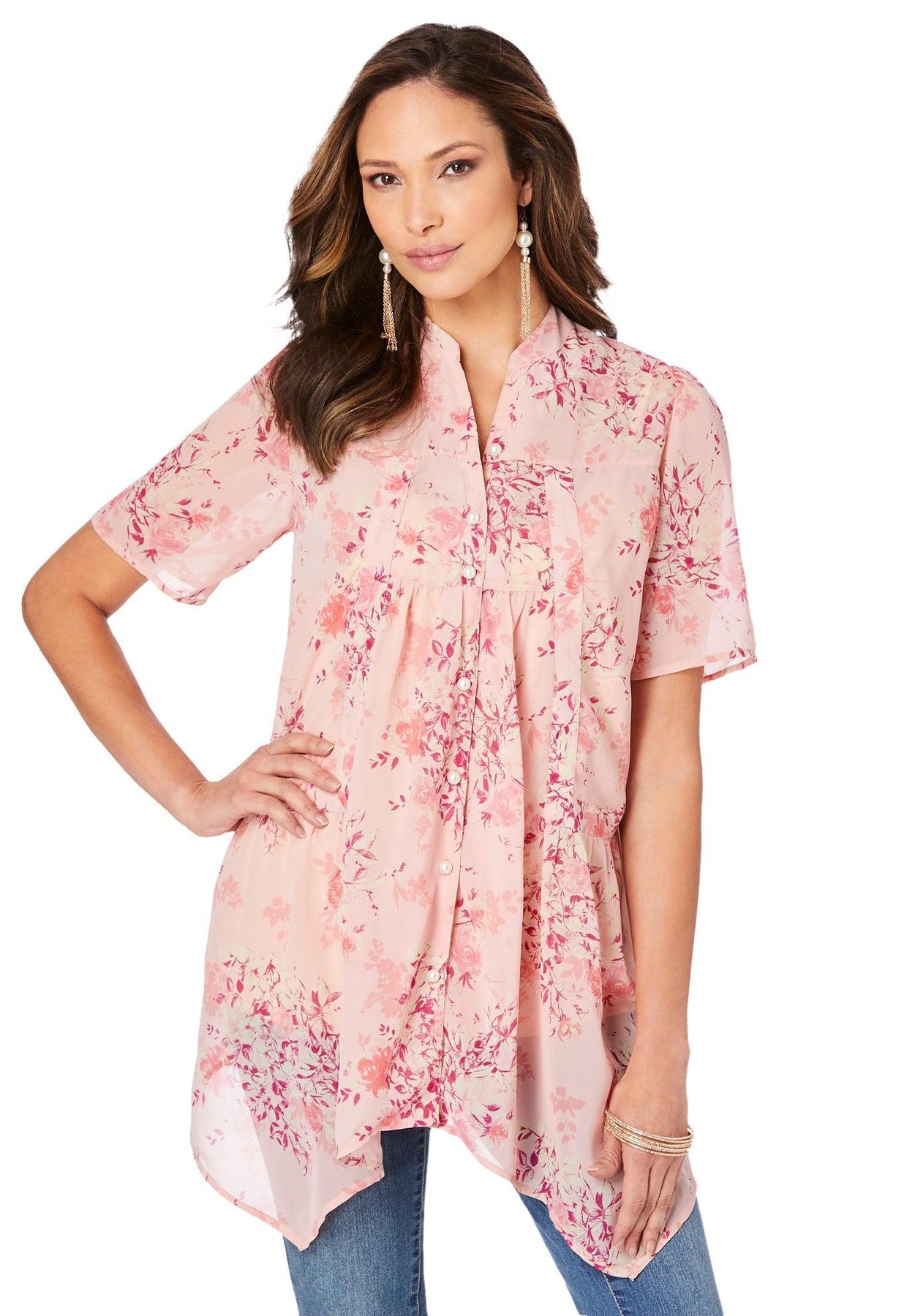 Pretty in print, this blouse is perfect for every occasion. Made from lightweight and flowy georgette fabric, it's finished with a handkerchief hemline and mandarin-style collar. Button-front style with shirred front-and back yoke. Swing silhouette.