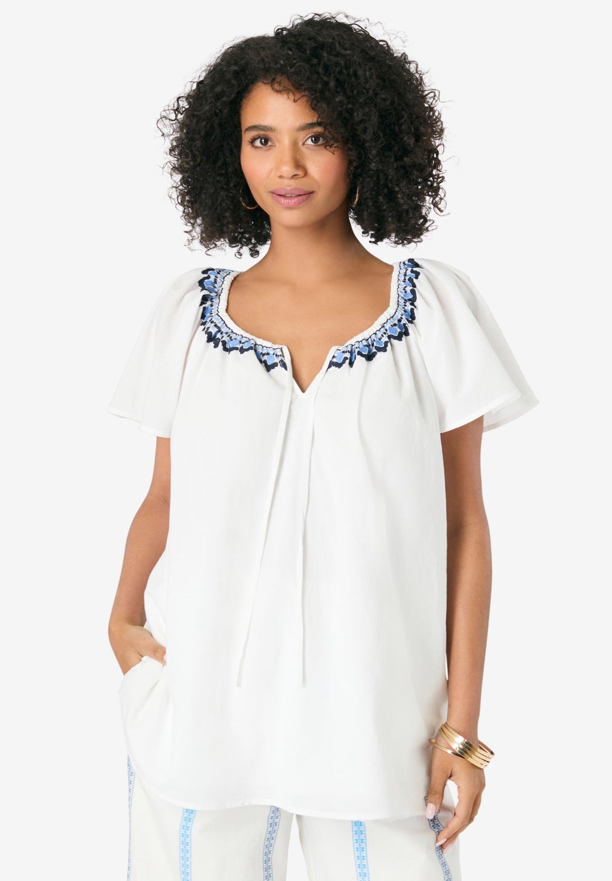 Add a breezy and beautifully embroidered blouse to your warmer-weather wardrobe. It's woven from cotton voile and features short flutter sleeves and intricate embroidery around its square neckline. A-line silhouette. Straight hem. Side slits.