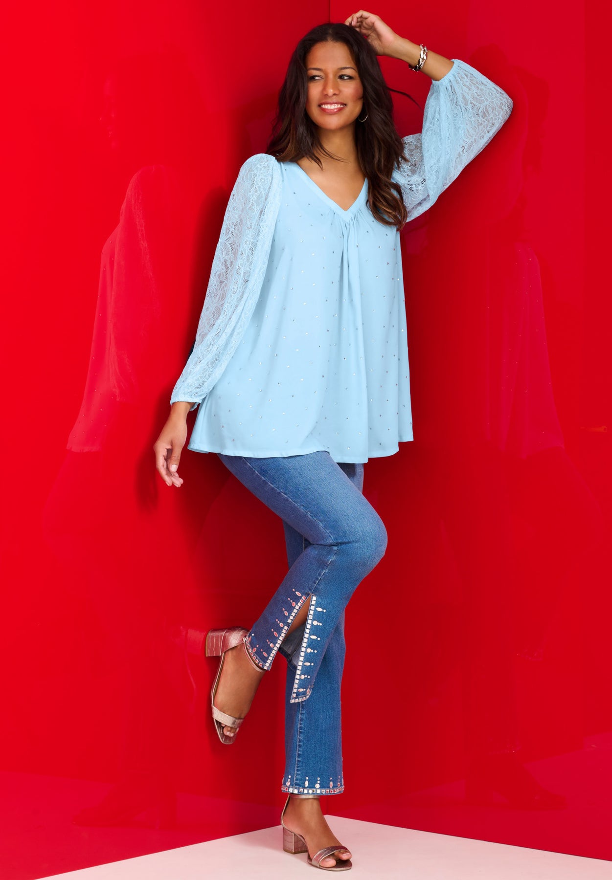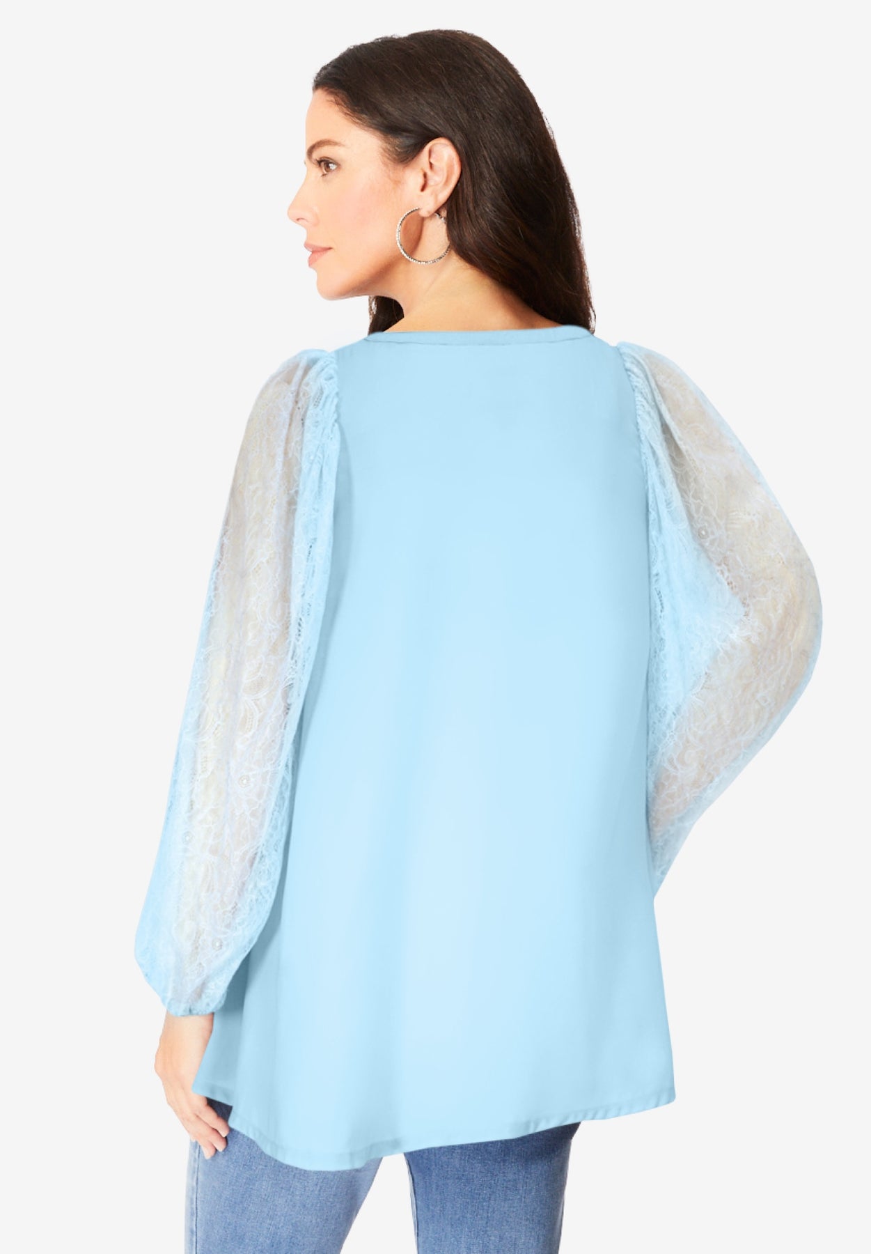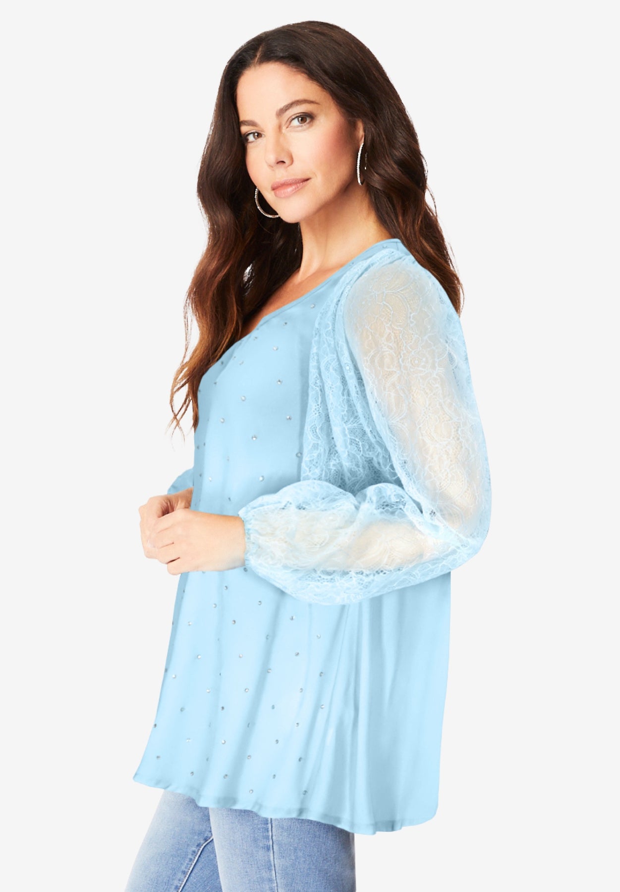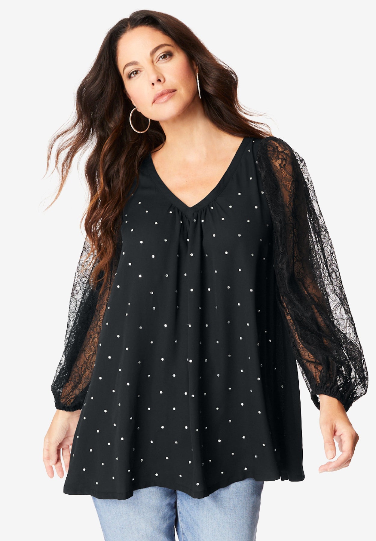 Two wardrobe details that define the holiday season? Lace and rhinestone, of course. Designed for a loose, comfortable silhouette adorned with rhinestones, this top has voluminous, blouson lace sleeves, making it perfect for every one of your holiday parties. V-neckline with light shirring. Blouson lace sleeves with elasticated cuffs. Allover rhinestones. Loose silhouette.