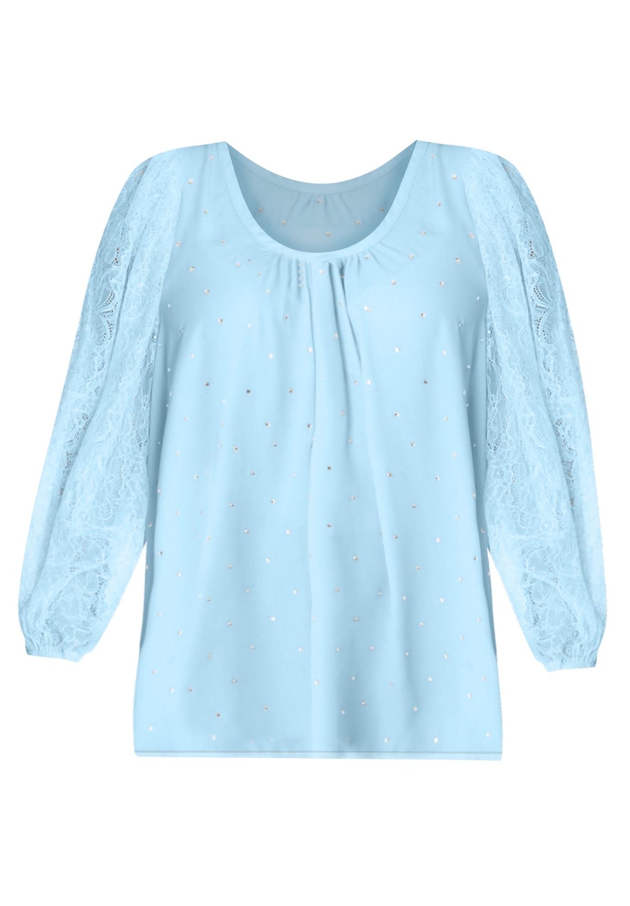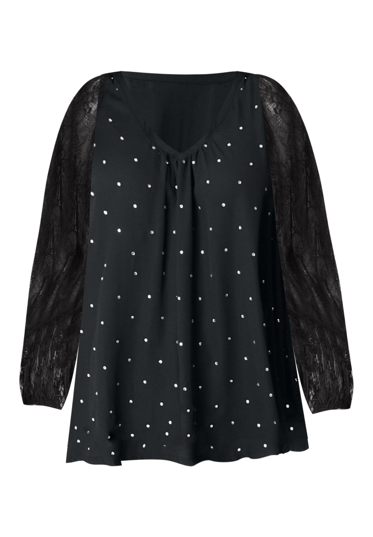 Two wardrobe details that define the holiday season? Lace and rhinestone, of course. Designed for a loose, comfortable silhouette adorned with rhinestones, this top has voluminous, blouson lace sleeves, making it perfect for every one of your holiday parties. V-neckline with light shirring. Blouson lace sleeves with elasticated cuffs. Allover rhinestones. Loose silhouette.
