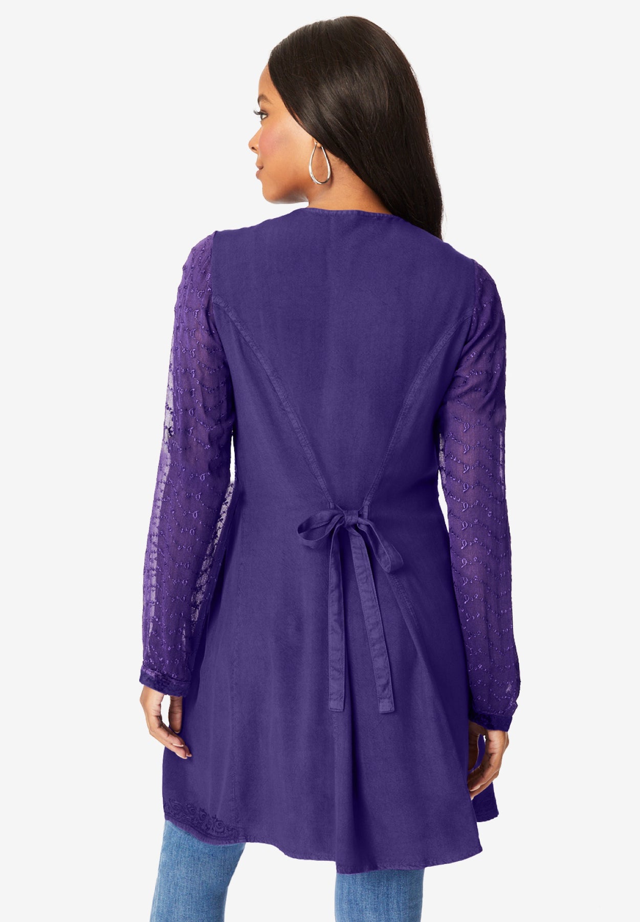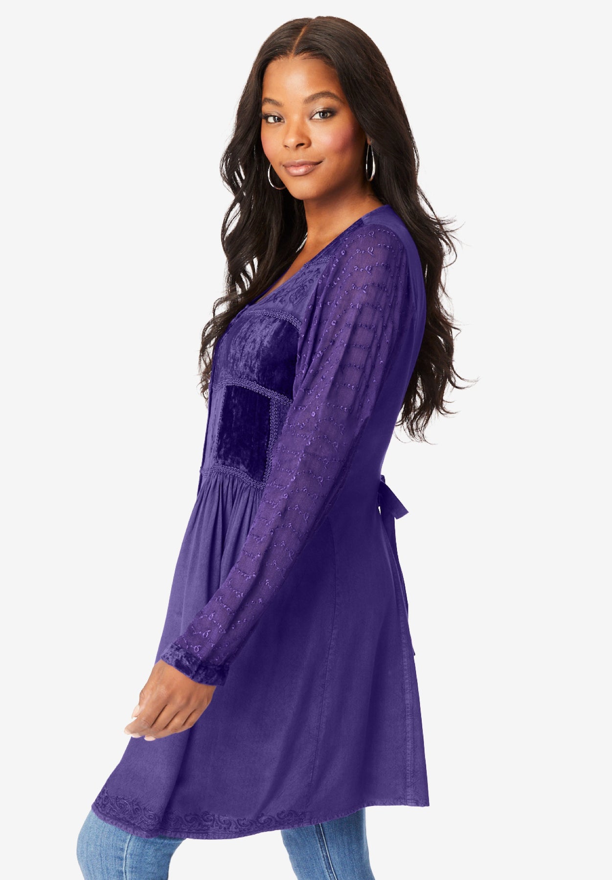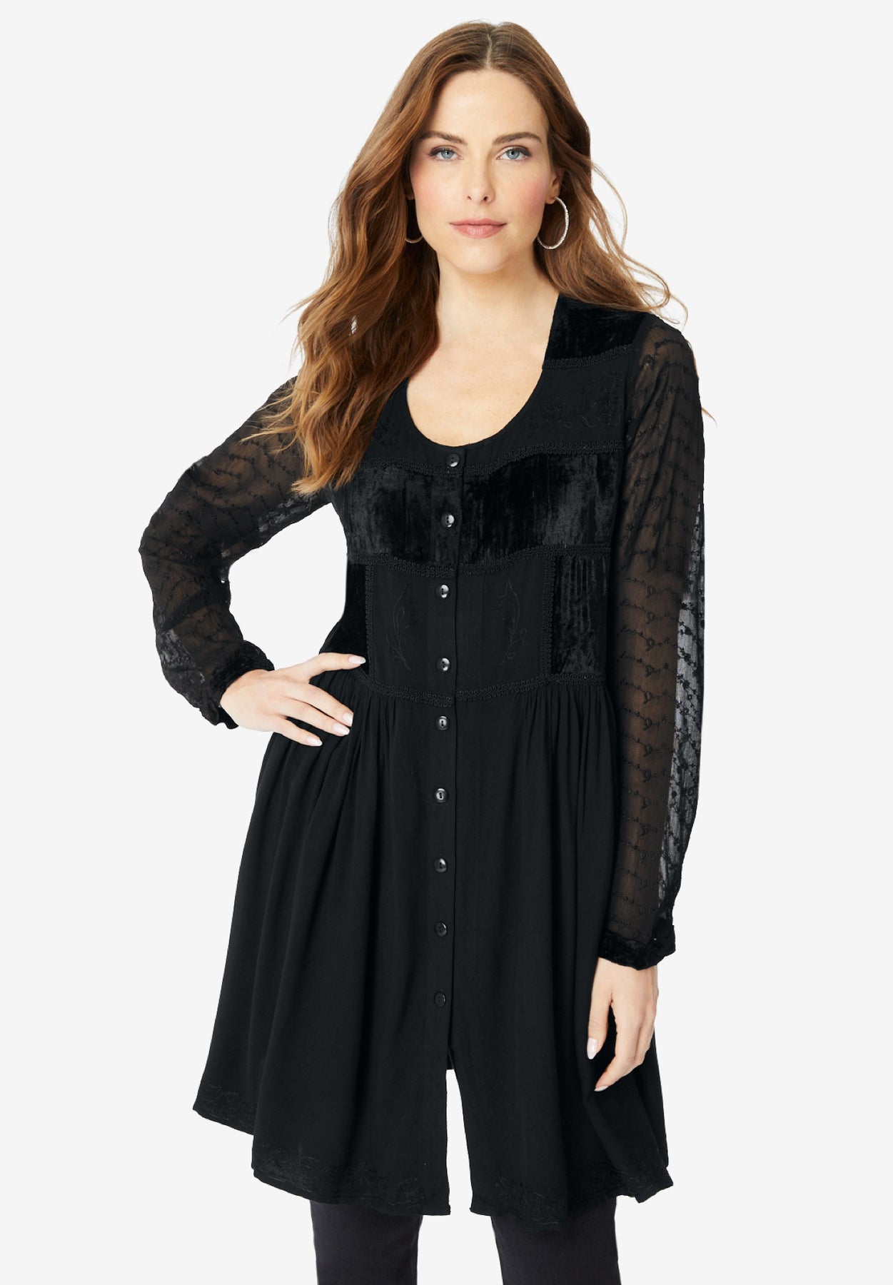 Our signature Acid Wash Big Shirt gets a new look thanks to panels of rich velvet. This flowing fit-and-flare top is fashionably oversized, with a button front, statement-making sleeves and flattering scoop neckline.