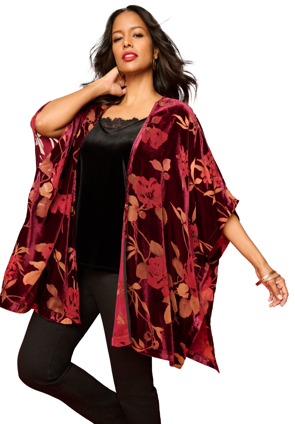 This kimono jacket is crafted from luxurious burnout velvet, giving it a rich texture and subtle sheen. It showcases a stylish open-front design, accented with delicate embroidered borders and sleeves. The relaxed fit, side slits, and sleek straight hem create a graceful and fluid silhouette.