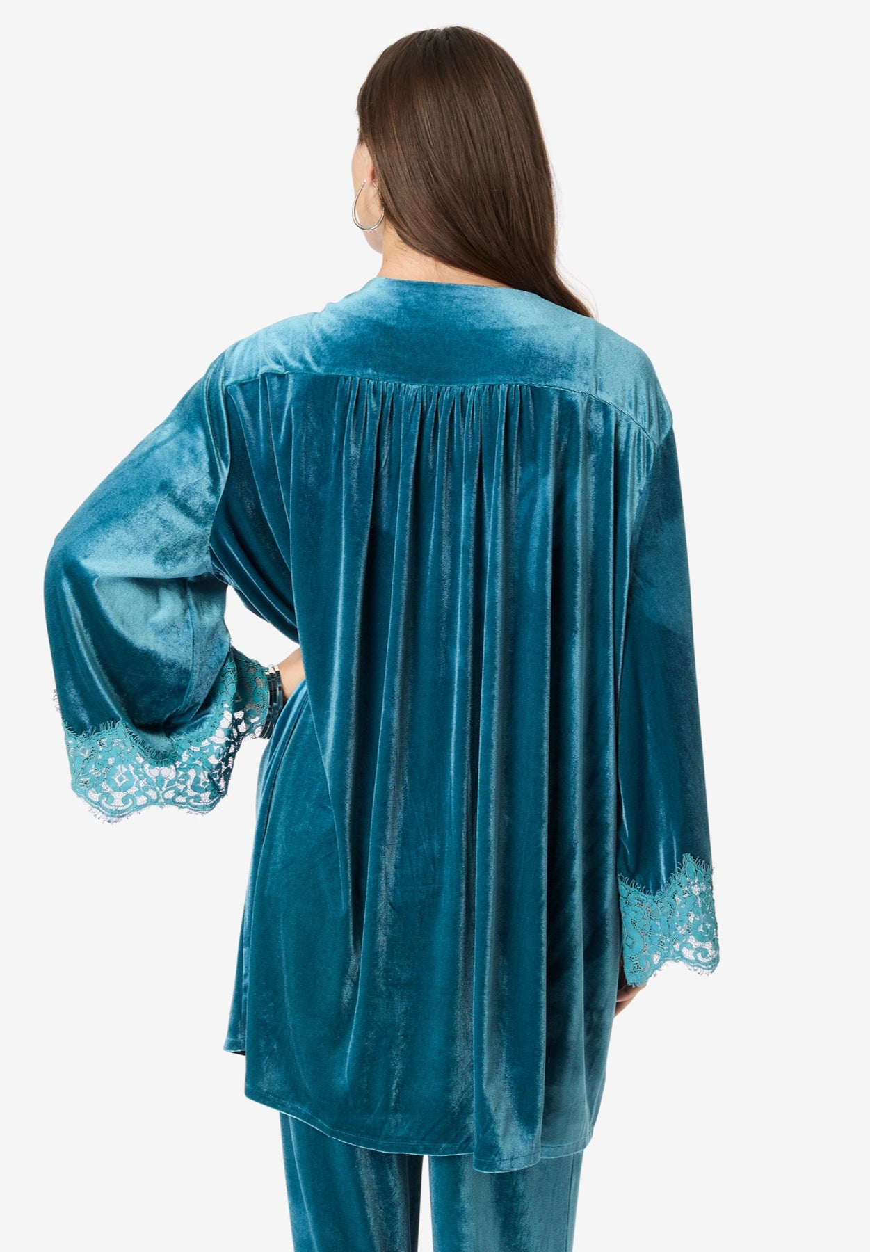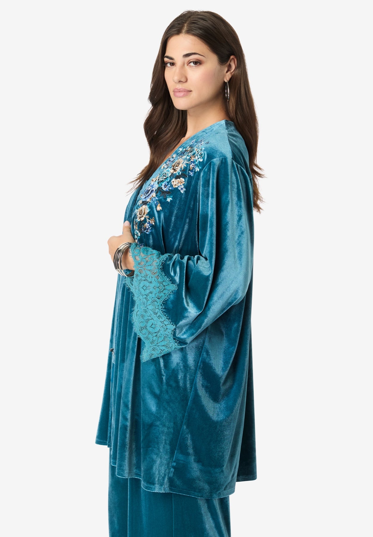 Elevate your wardrobe with this versatile velour kimono jacket, designed to add a touch of sophistication to any outfit. With beautiful floral embroidery detail at the front, this relaxed-fit jacket boasts a shirred back yoke and three-quarter bell sleeves trimmed with delicate lace. It's the perfect blend of comfort and style, equally fitting for a casual brunch or a chic cocktail party.