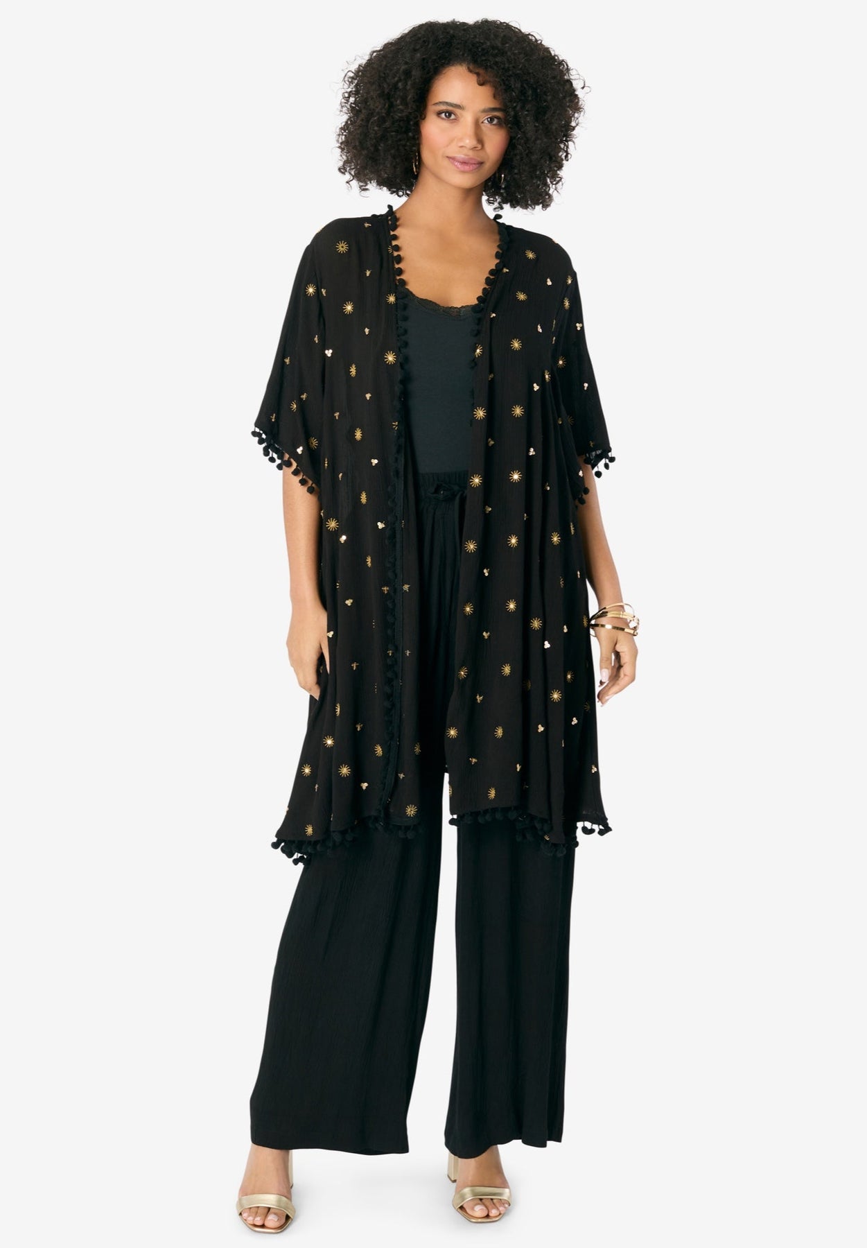 With a delicate crochet back panel and subtle metallic detailing, this kimono combines boho charm with a hint of luxe. Perfect for layering, it adds a touch of intricate texture and shine to any look.