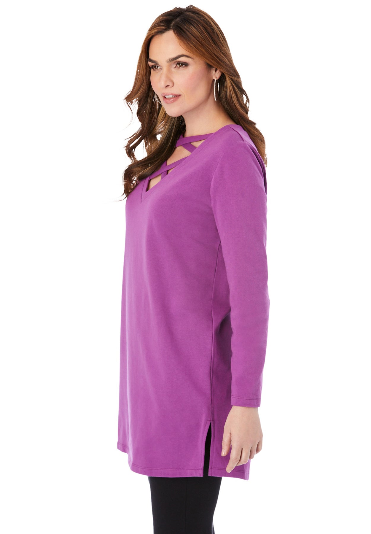 The V-neck with crisscross straps and high side slits amp up your off-duty look, while the longer tunic length covers more and hits just where you want it to. Made of so-soft baby French terry, it hits that sweet spot of comfy, casual, and cool. Scoop back.