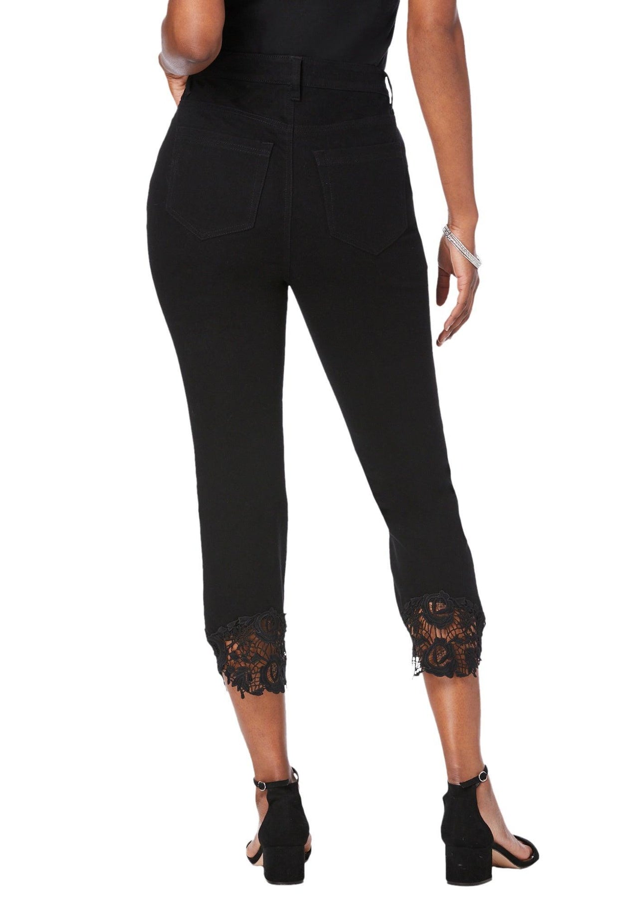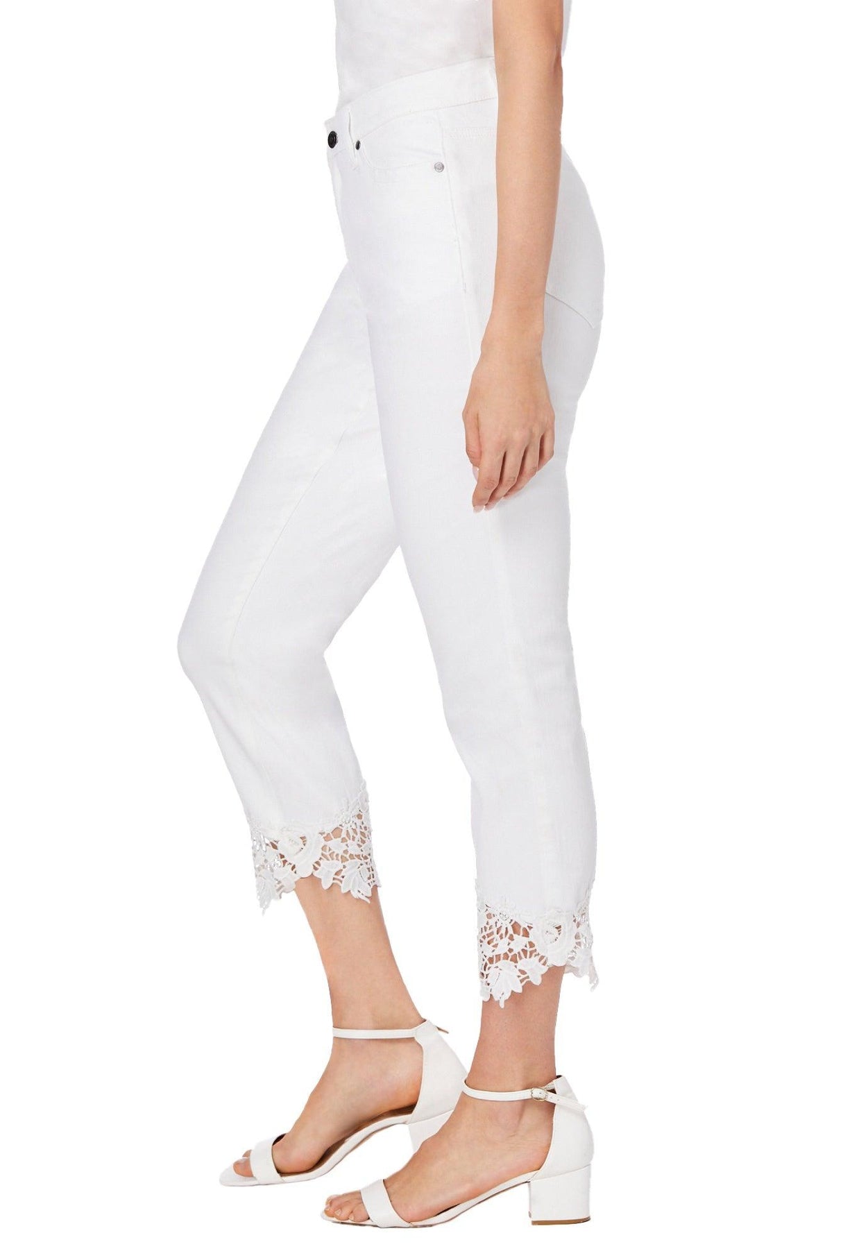 The cool, crop flare cut goes romantic with a pretty scalloped lace hem. These are the perfect jeans to lighten up your wardrobe. Five-pocket styling.