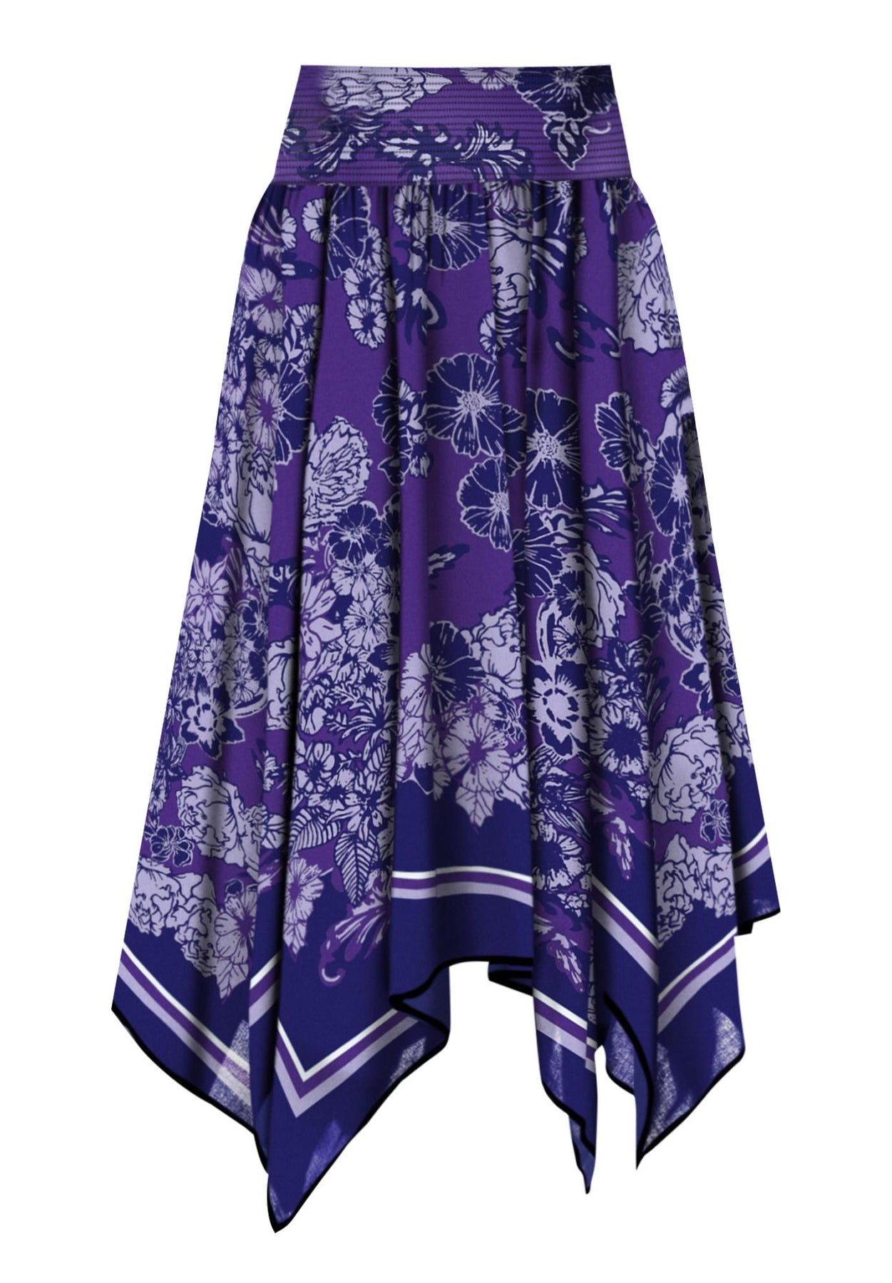 Make any outfit unique and elegant with a gorgeous scarf-print skirt. Smocked, elasticized waistband and asymmetric handkerchief hem.