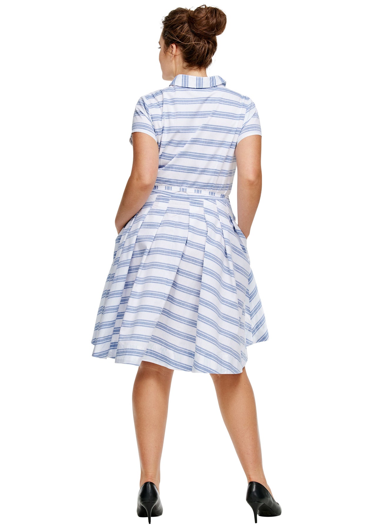 Full button front dress with shirt collar and slight Y-neck. All-around pleats. Belt loops with tie. Pockets. Front princess seams and back waist darts.