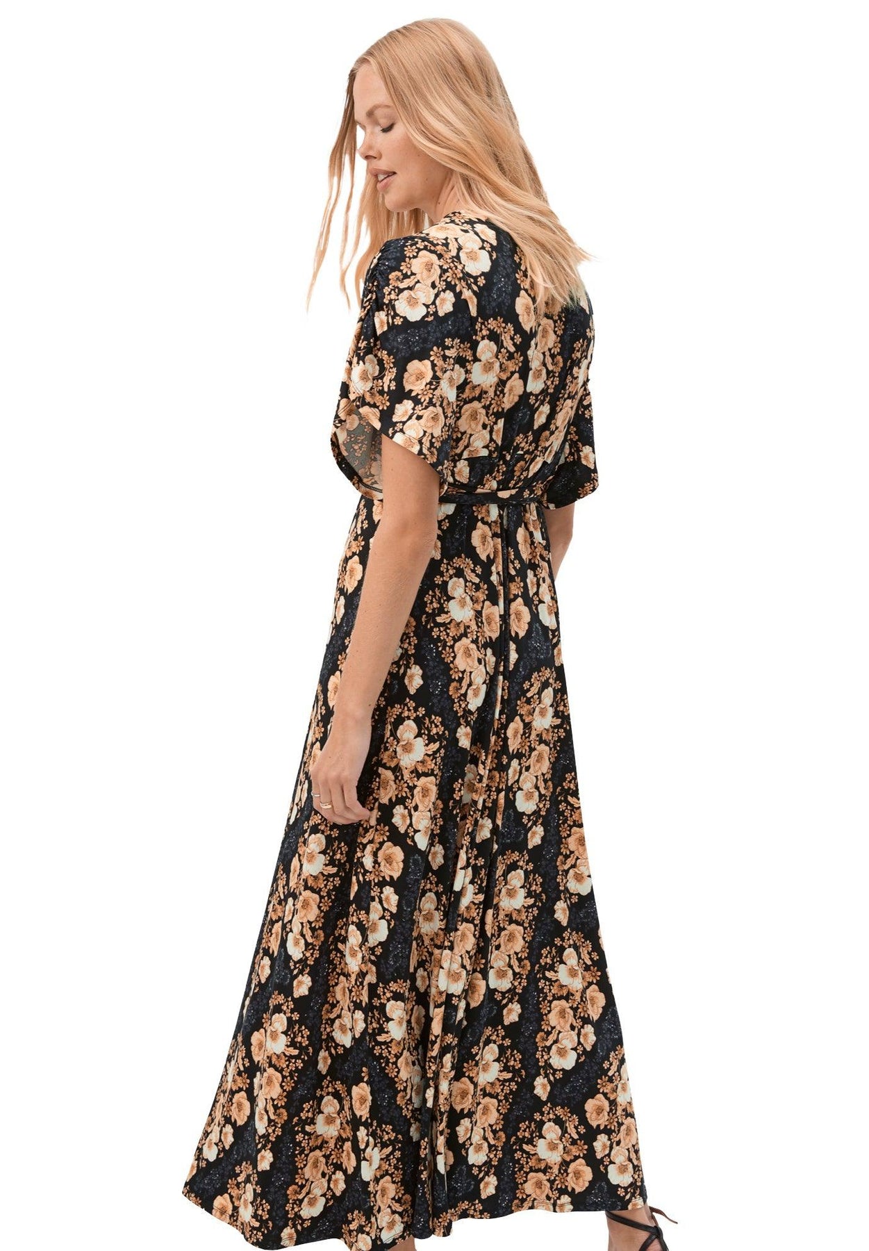 Make a statement at your next outdoor event with this très chic one-piece wonder. Complete your look with a clutch and strappy heels.  Features gathered wide elbow sleeves, drop shoulders with shirring & self sash attached to the front empire seam that ties in the back.
