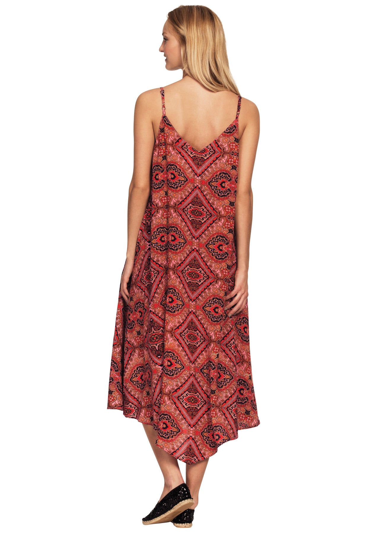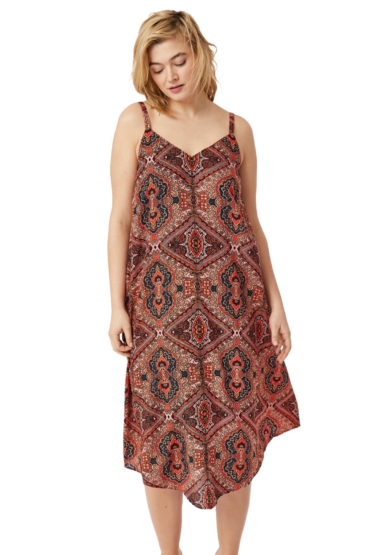 Printed hanky hem dress in A-line silhouette. V-neckline. Sleeveless with adjustable self straps. Pointed front and back hem.