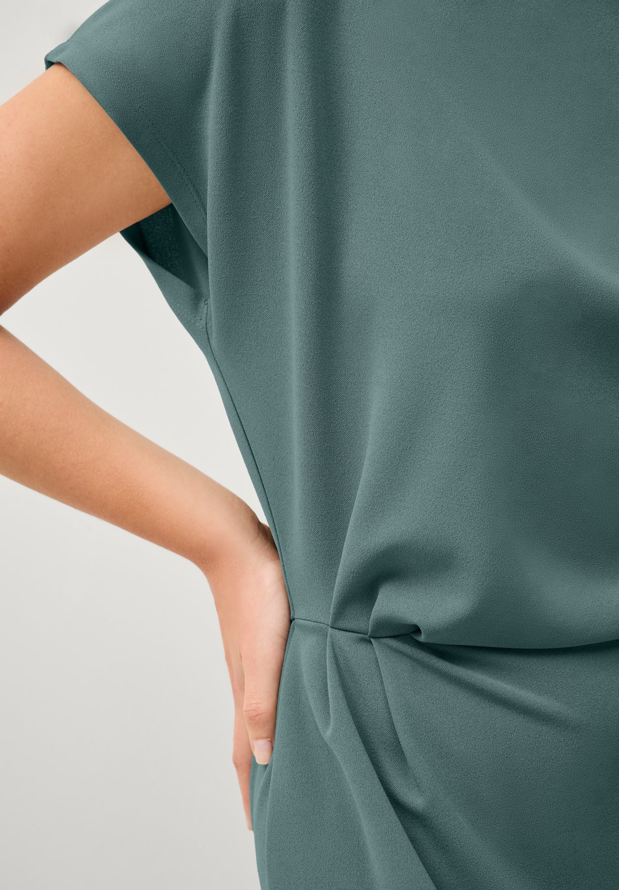 - Gathered folds at shoulder and opposite waist seam