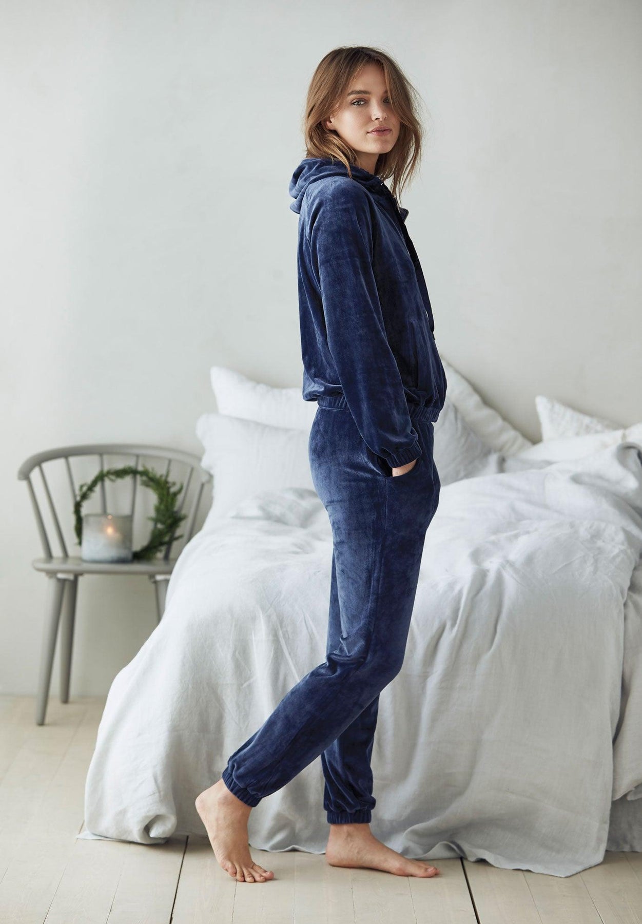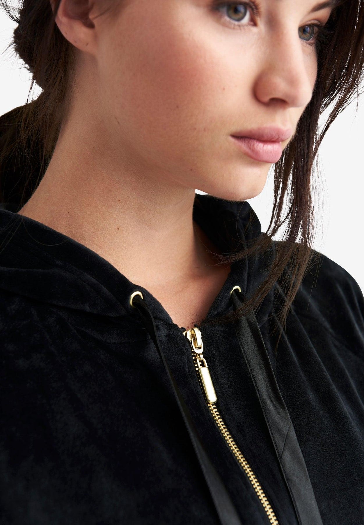 Casual & sporty, this plush velour sweatshirt has a cool satin ribbon drawstring & metal trim. It's just what you need to update your athleisure collection.