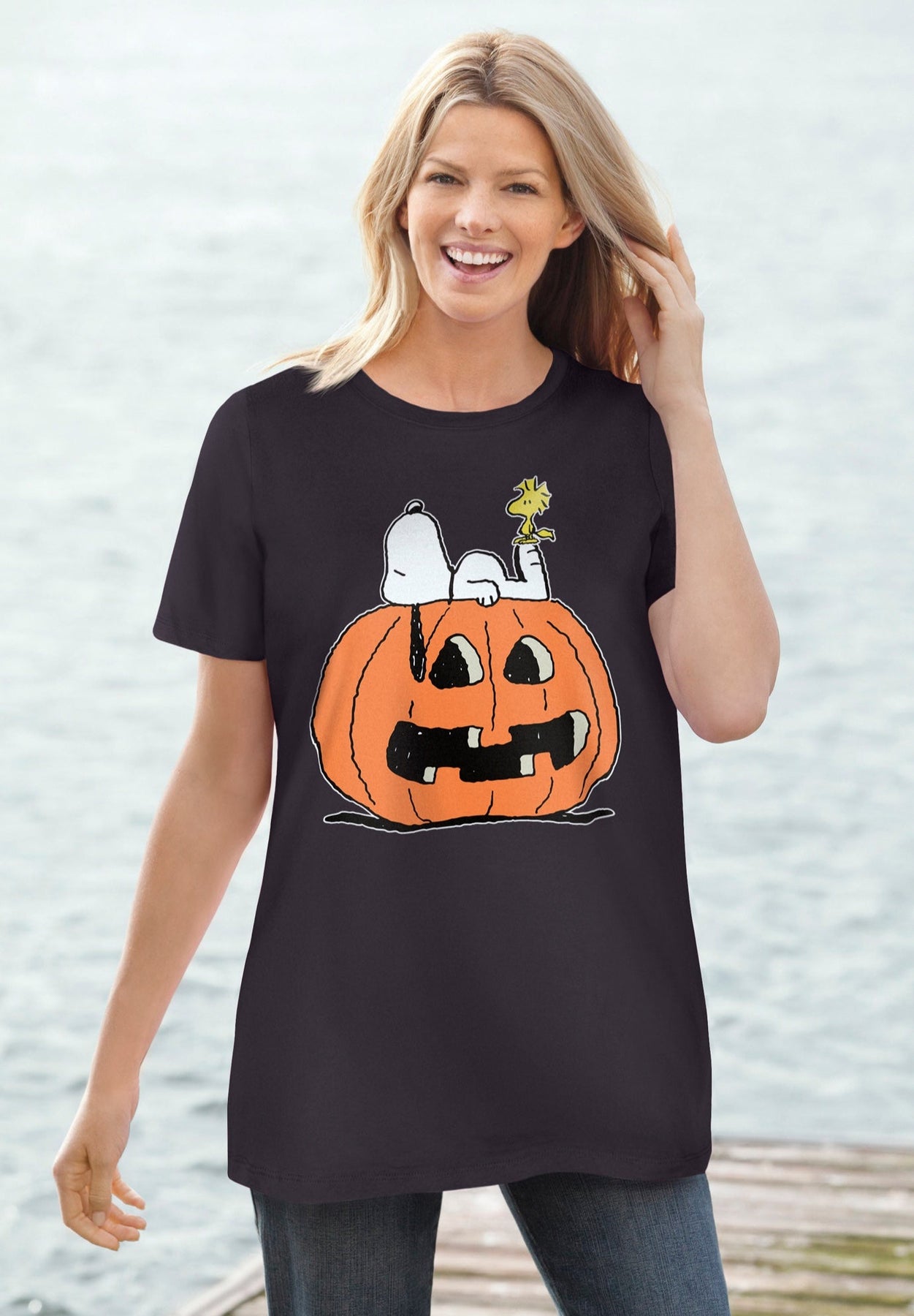 Your favorite Peanuts characters in the Perfect Tee fit! Fun Halloween prints in this classic crewneck. Wear this flattering relaxed fit short sleeve in any season. This comfy, cute essential pairs perfectly with jeans and leggings.