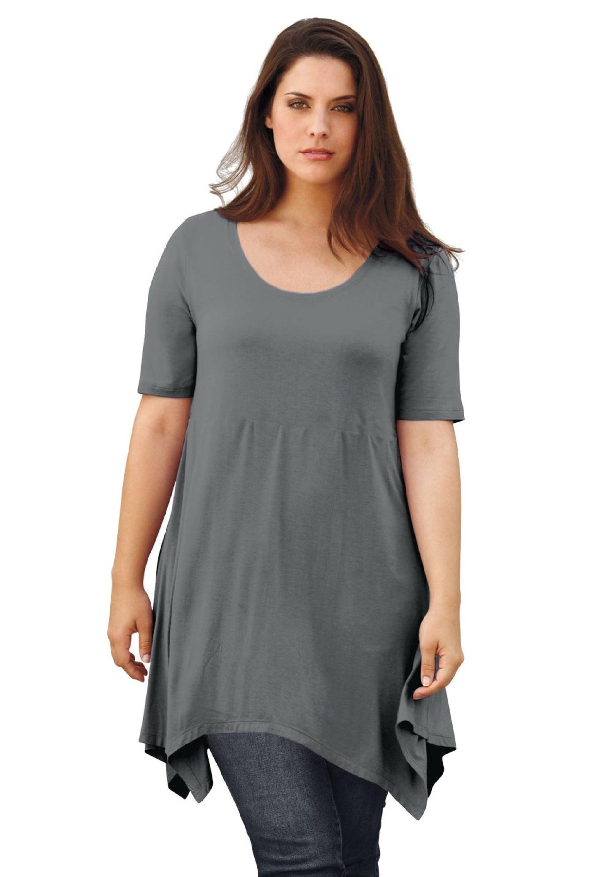 Scoop neckline tunic with hanky hem. Elbow-length sleeves.