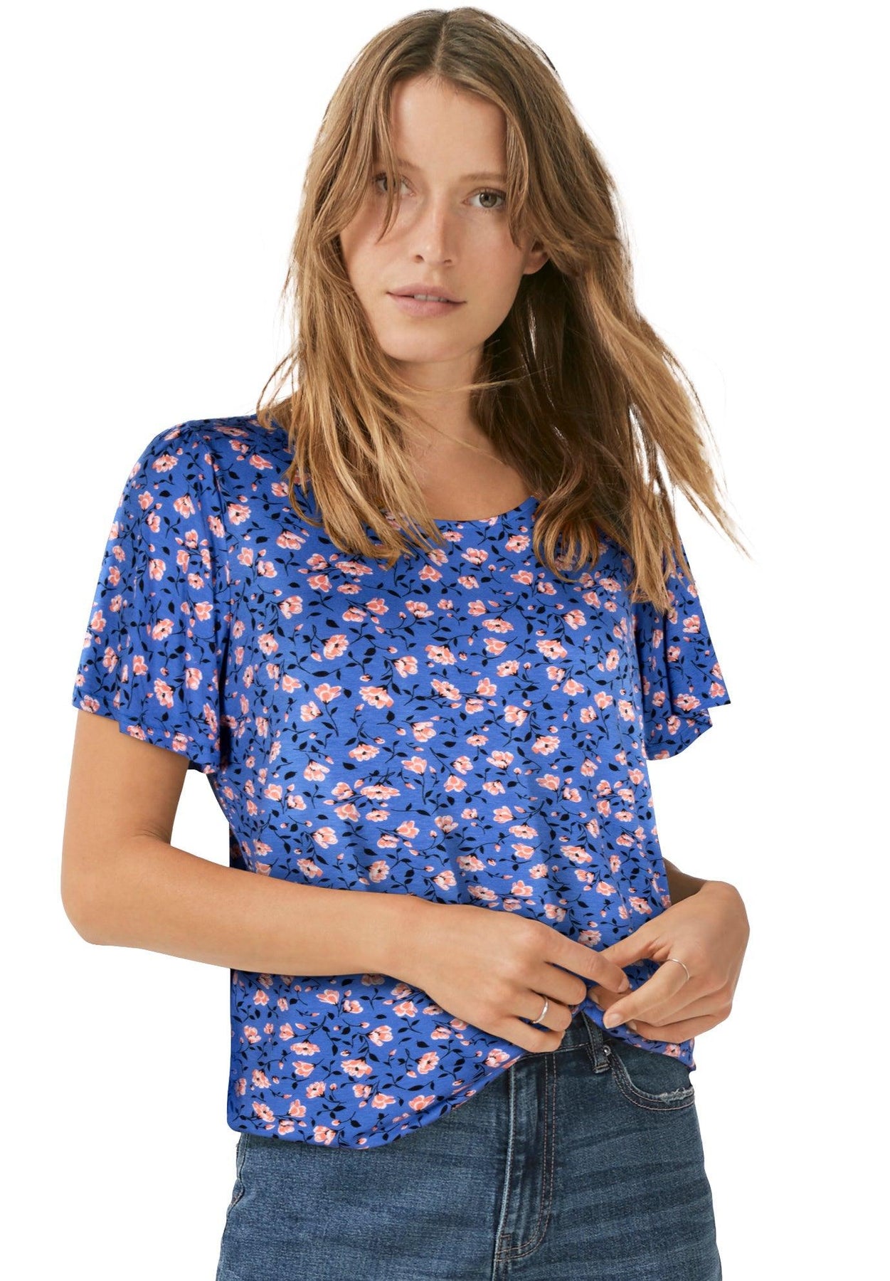 This tee takes style up a few notches with flowy flutter sleeves. It dresses up any bottom you pair it with, and its face-framing scoop neck means it’s always camera ready. A-line silhouette