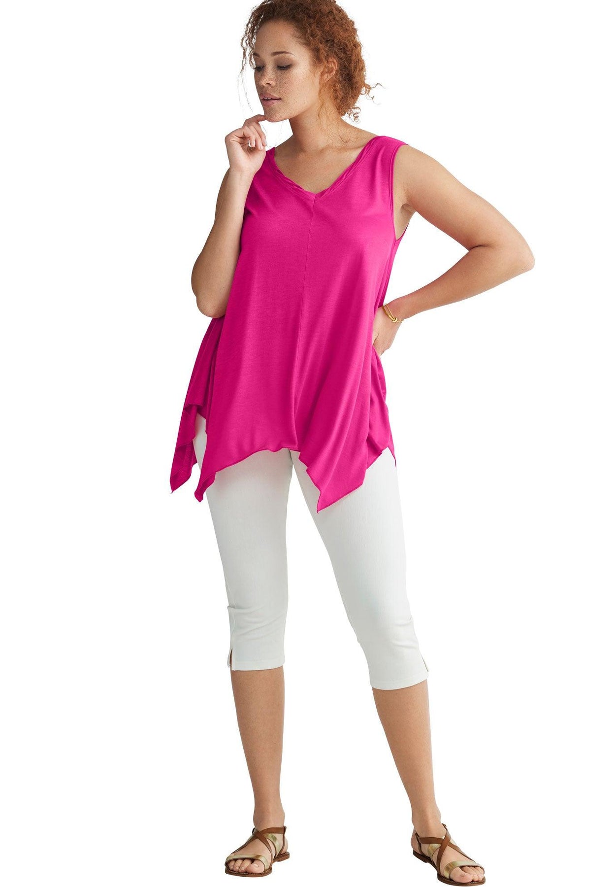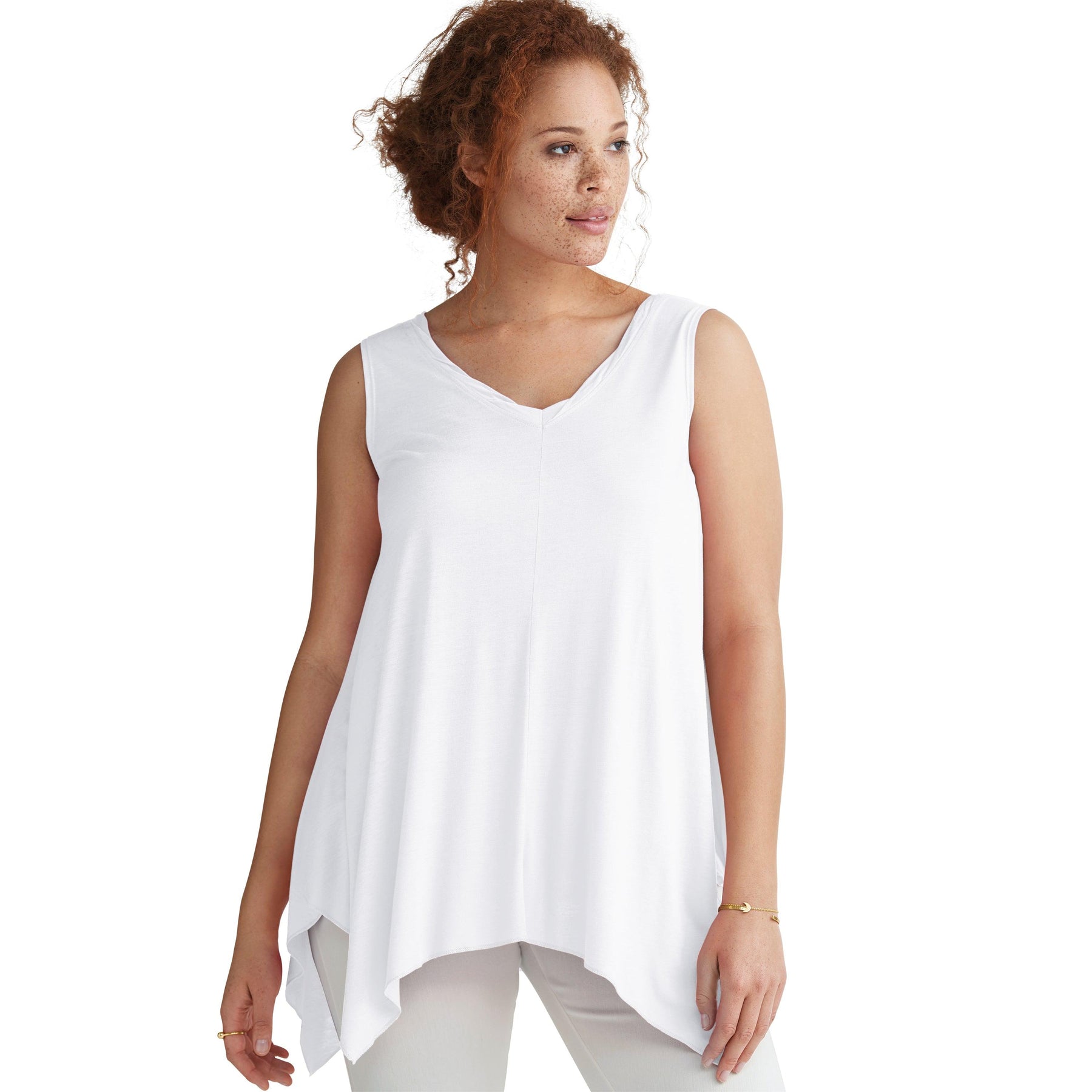 Sleeveless knit tunic tank in a trapeze silhouette has twisted front and back V-necklines. Pointed hanky unfinished bottom hem.