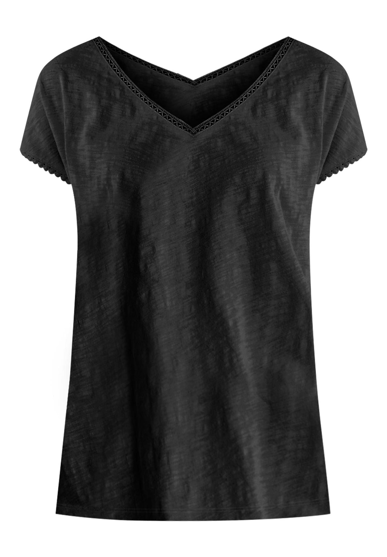 I got this in three colors and love them The crochet trim adds on a but of change from just a normal tshirt I love the deep vneck and it is super flattering