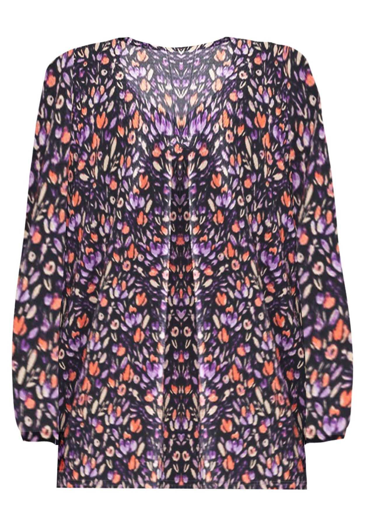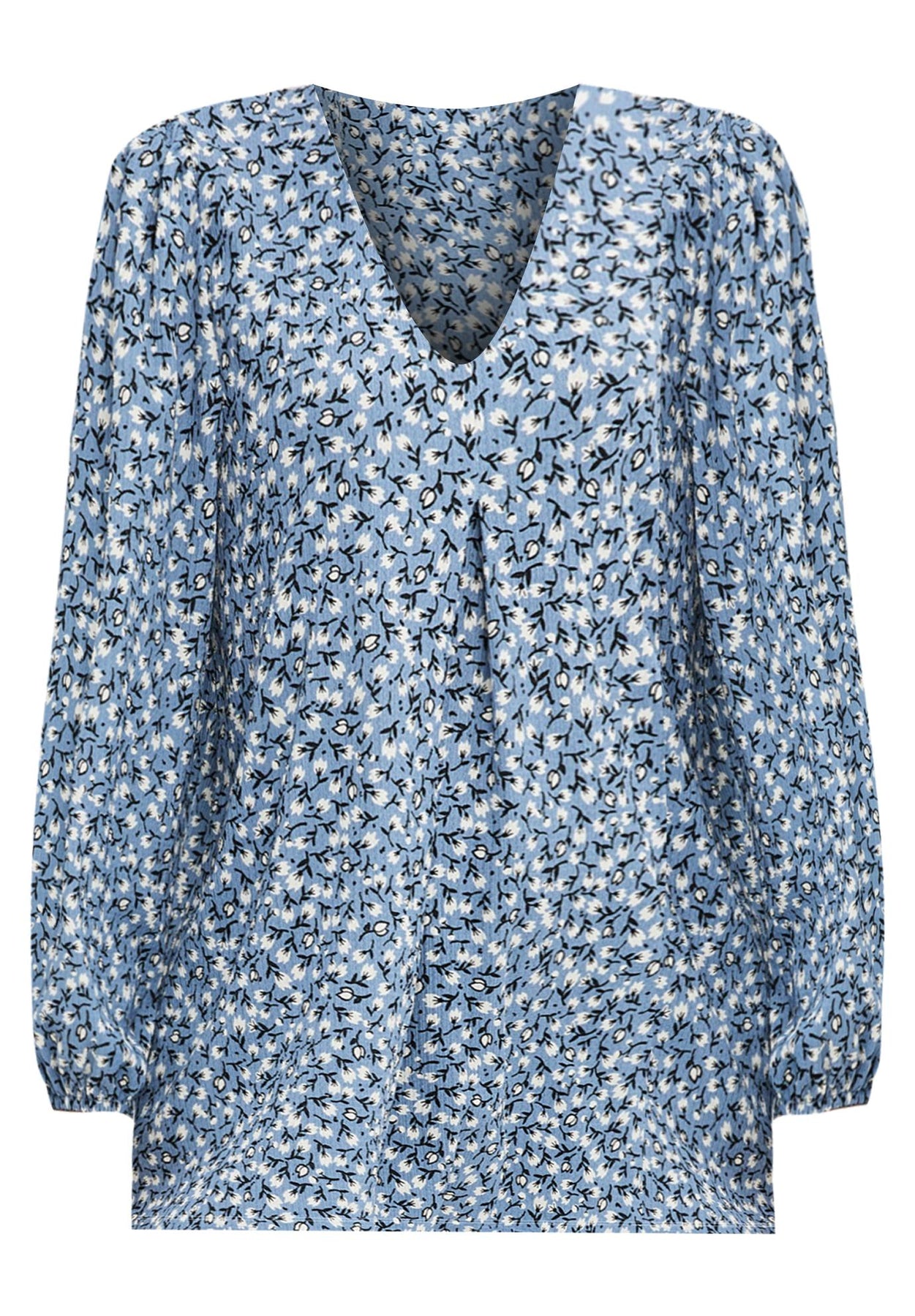 - Long blouson sleeves with elastic cuff