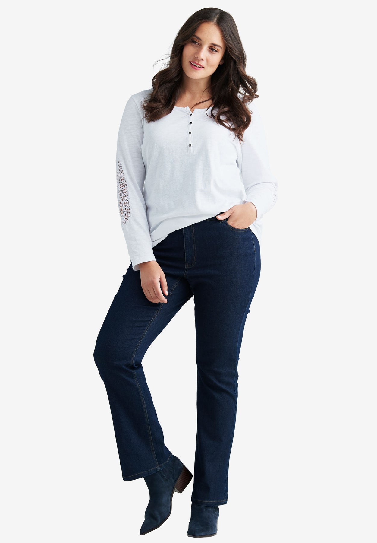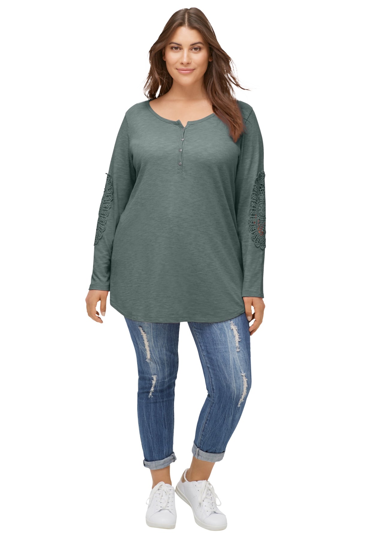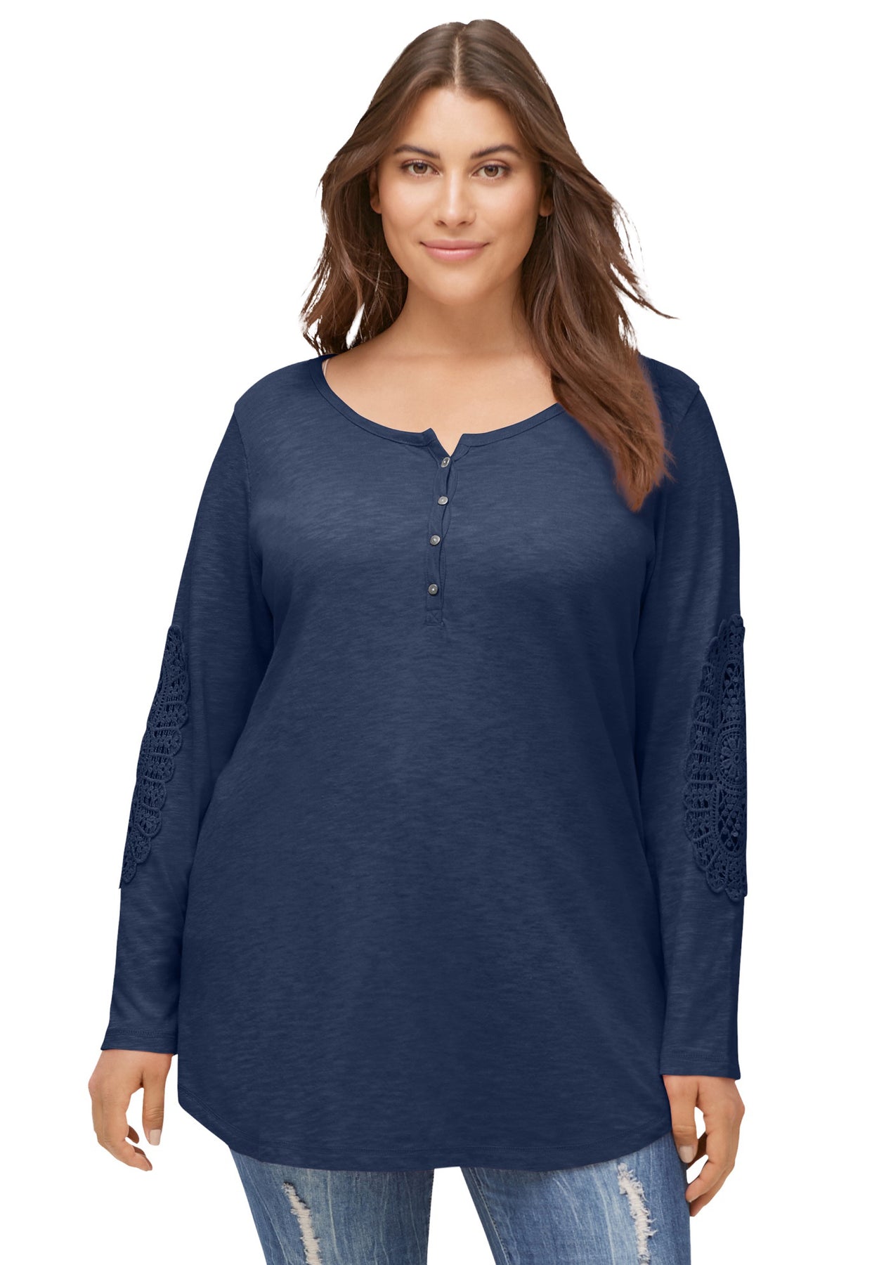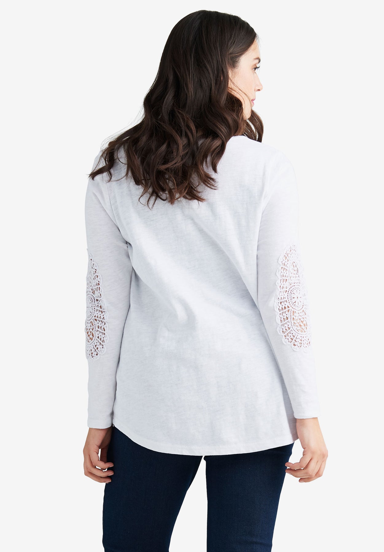 Crochet applique placed at elbows of long sleeves. Gunmetal buttons at neckline. Rounded shirttail hem.