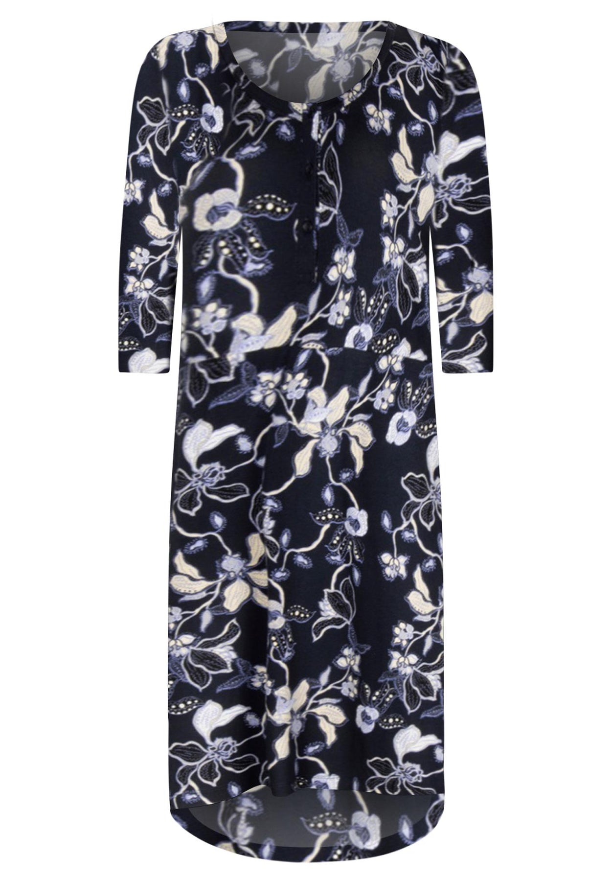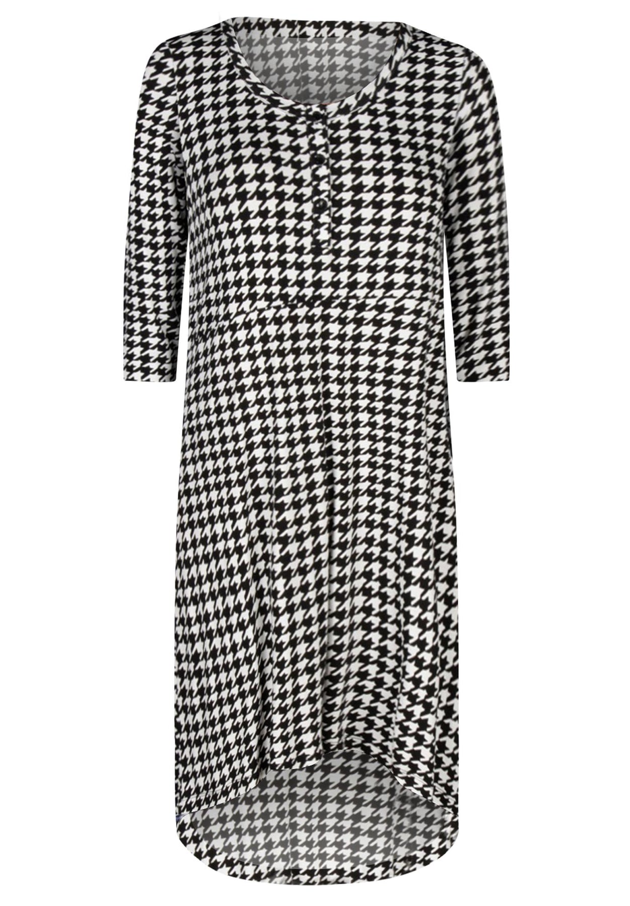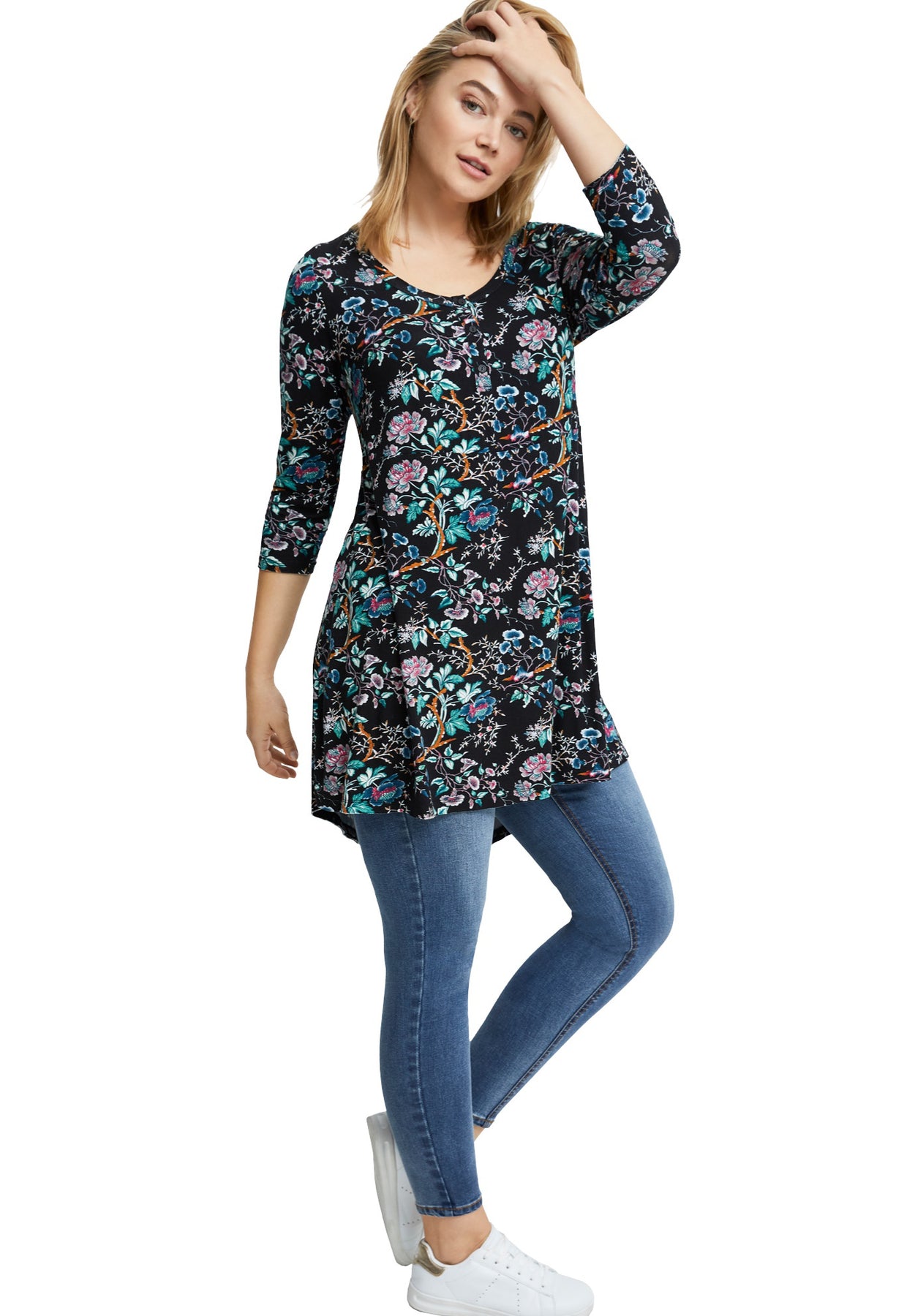Stretch knit tunic in A-line silhouette. Scoop neckline. Button henley placket. Empire seam in front, horizontal waist seam in back.