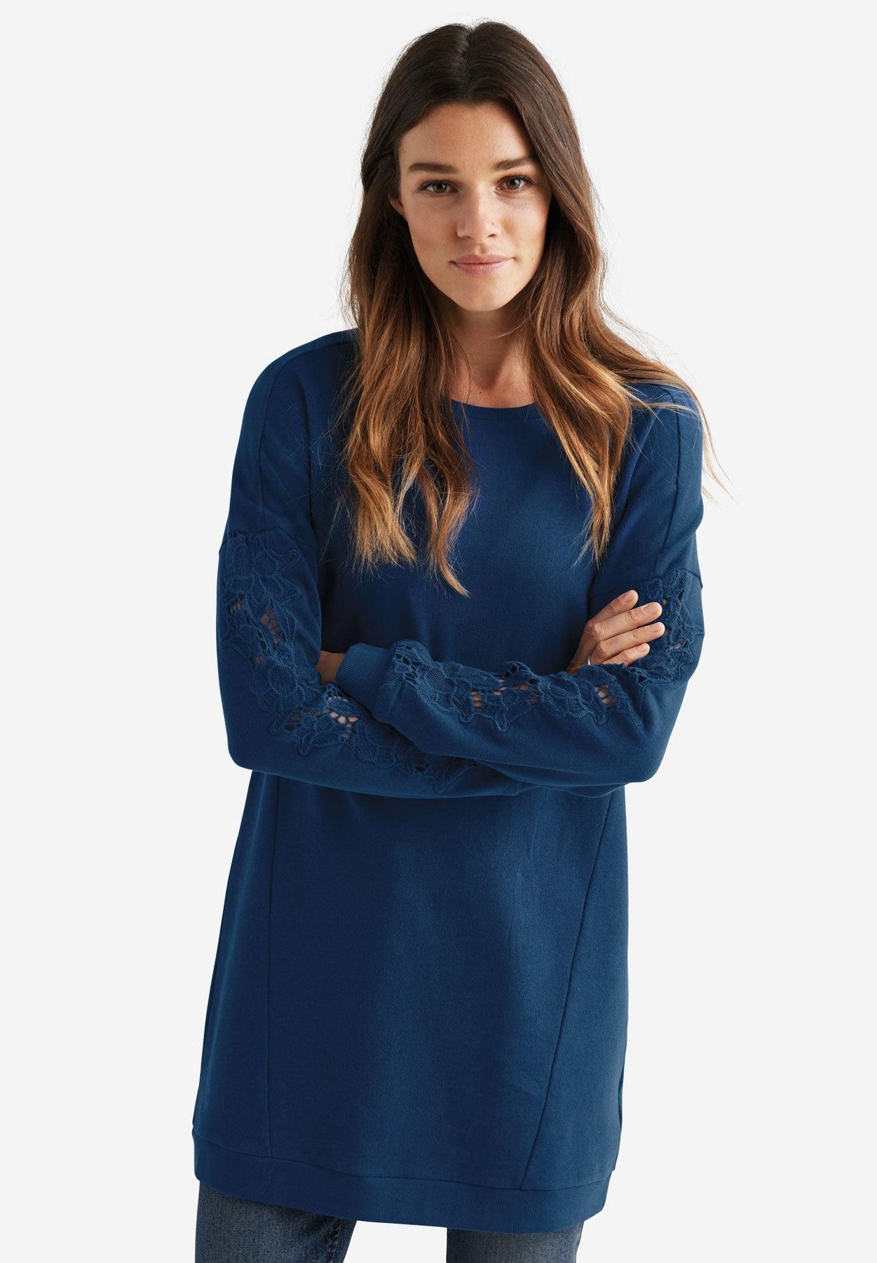 This laid-back sweatshirt gets a feminine update with floral lace along the sleeves. So versatile it's perfect by itself for lounging around or paired with denim & sneakers for the weekend. Wear it your way!