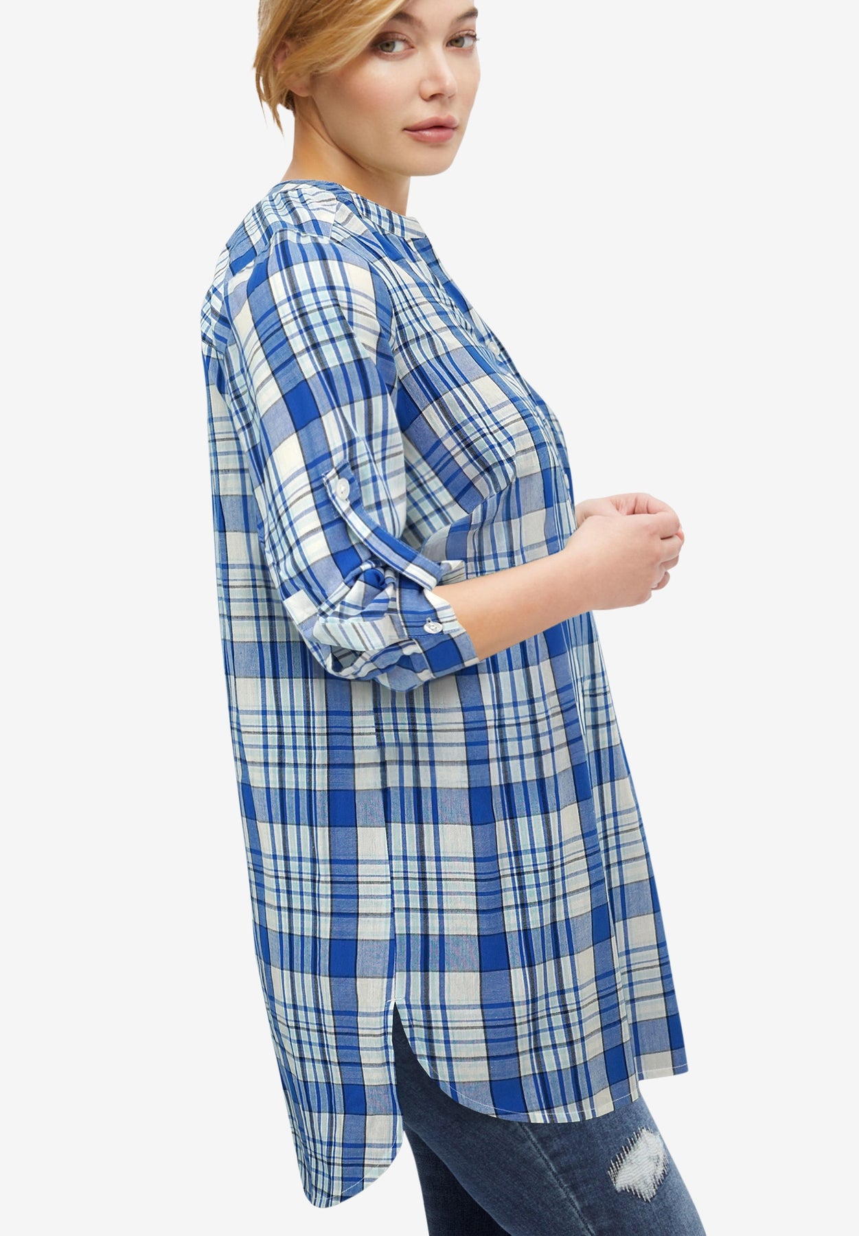 This easy, lightweight tunic is a must-have for all seasons. It's fashioned with a stylish Henley neckline and 3/4 roll-tab sleeves. An inverted back pleat gives it a relaxed silhouette that pairs perfectly with skinny jeans.