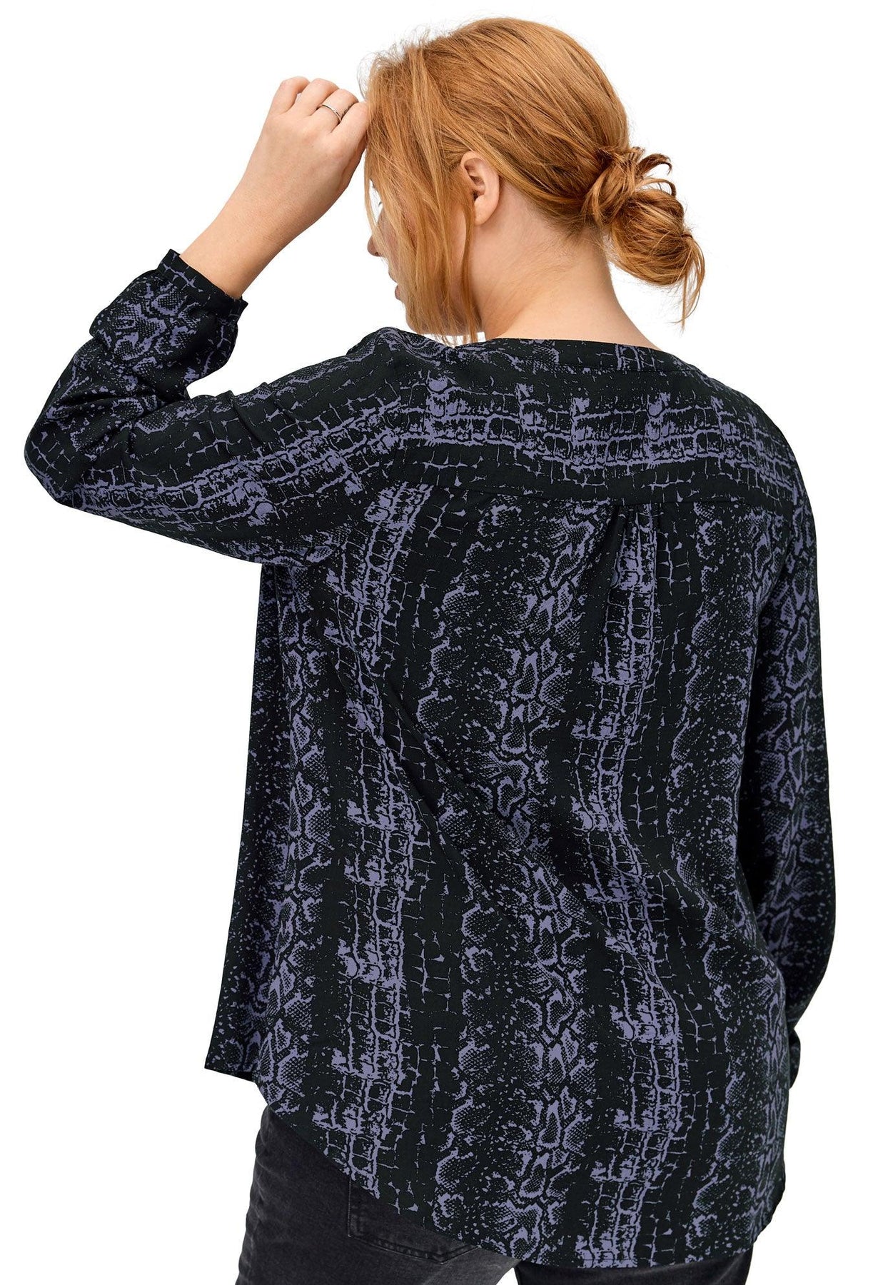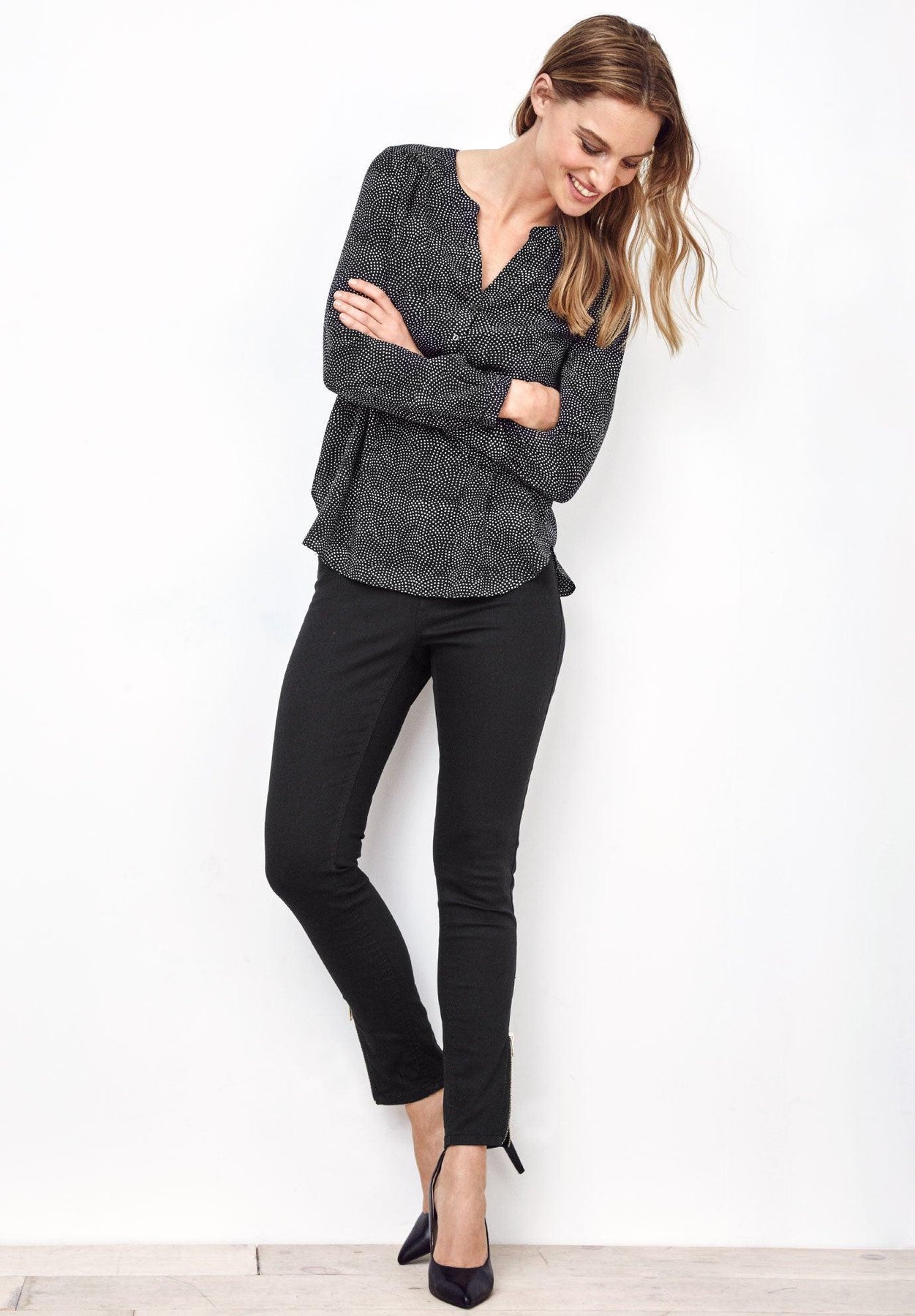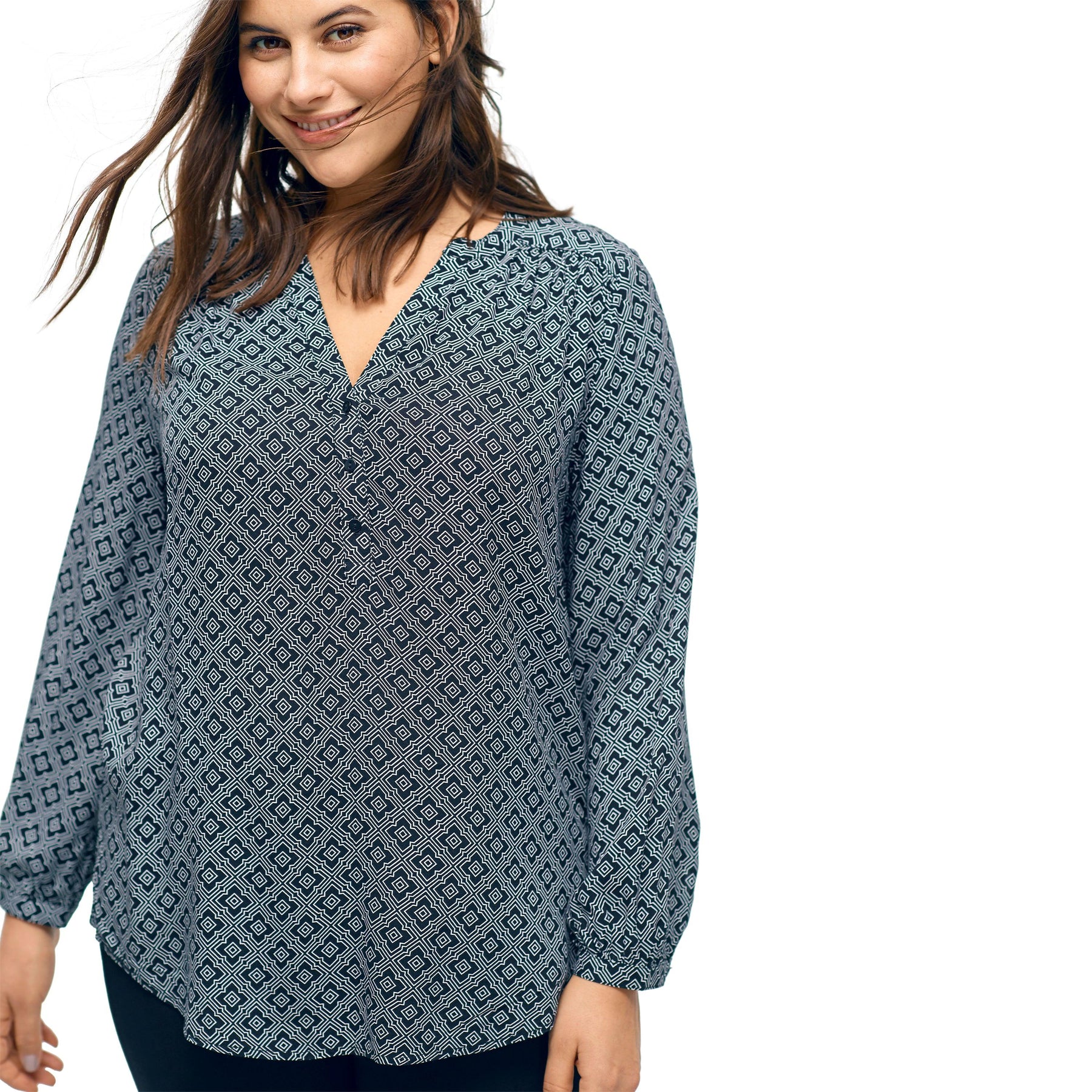 Tunic in a A-line silhouette with notch neckline and 3-button henley placket. Shirring at shoulders and back yoke. Long sleeves with button cuffs. Shirttail hem with side slits.