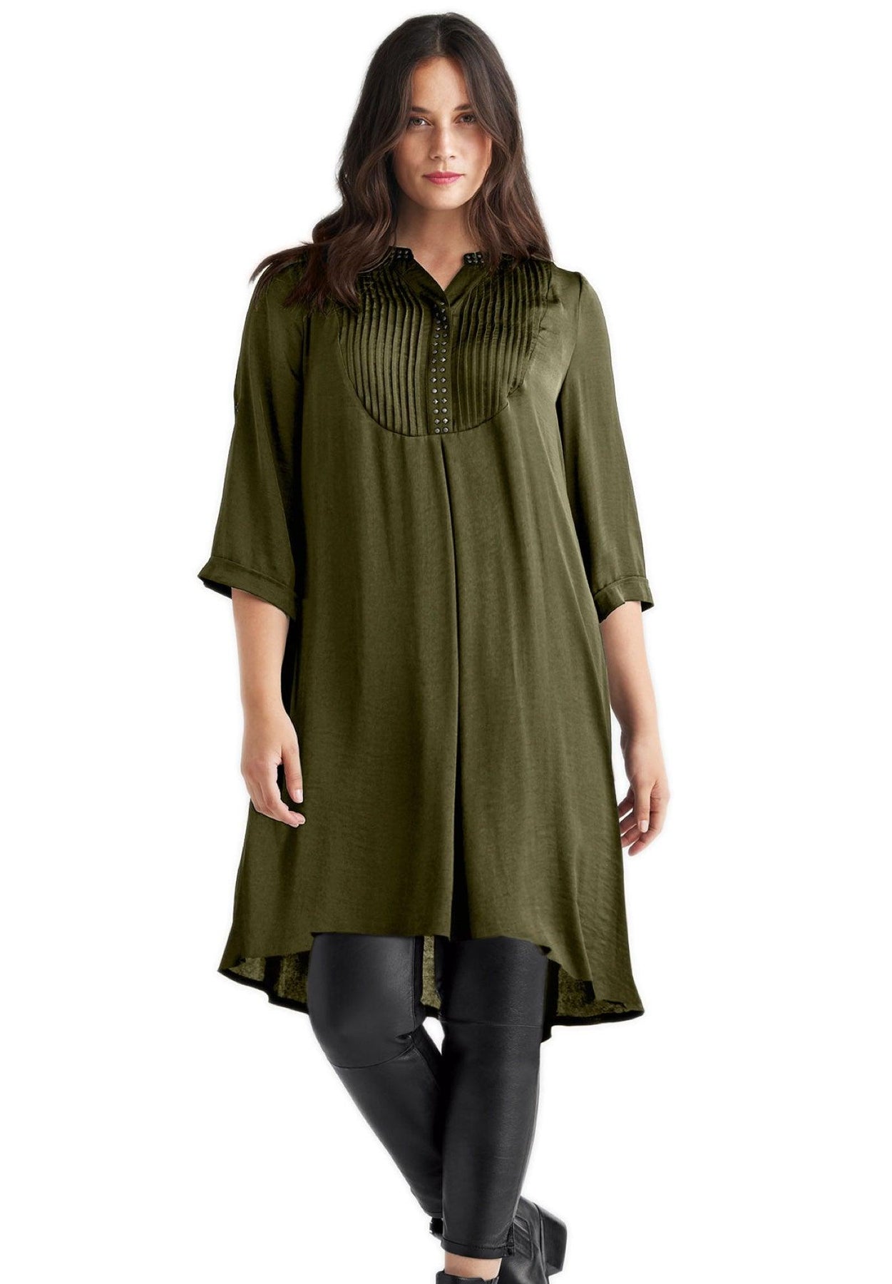 V-neckline with snap closure and pintucking. Decorative stud details at collar and placket. Roll-up sleeves with snaps. Inverted front and back pleats. High/low rounded hem with side slits.