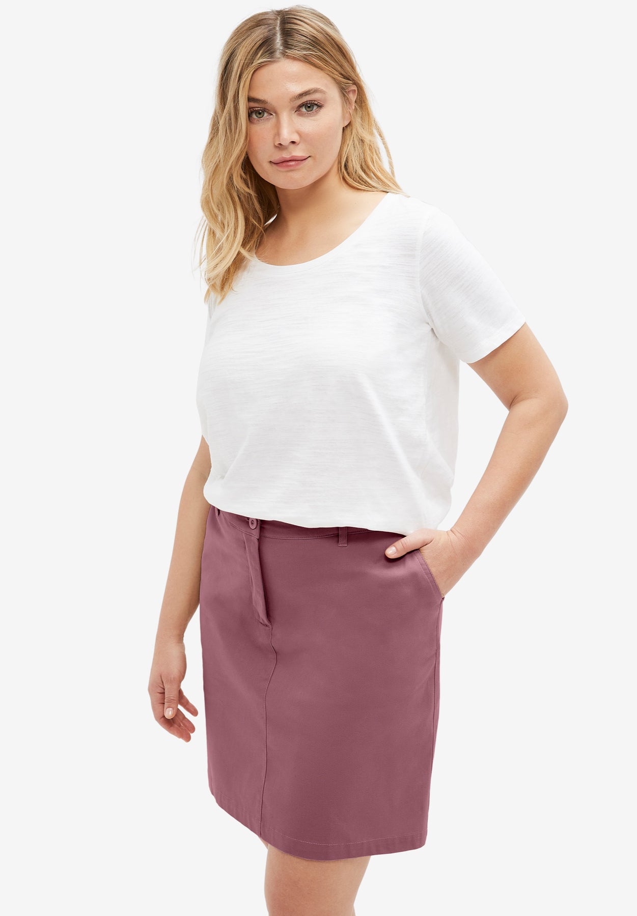 Knit shorts underneath skirt. Flat front, button/zip fly, belt loops. Front slash pockets, welt back pockets with button closure.