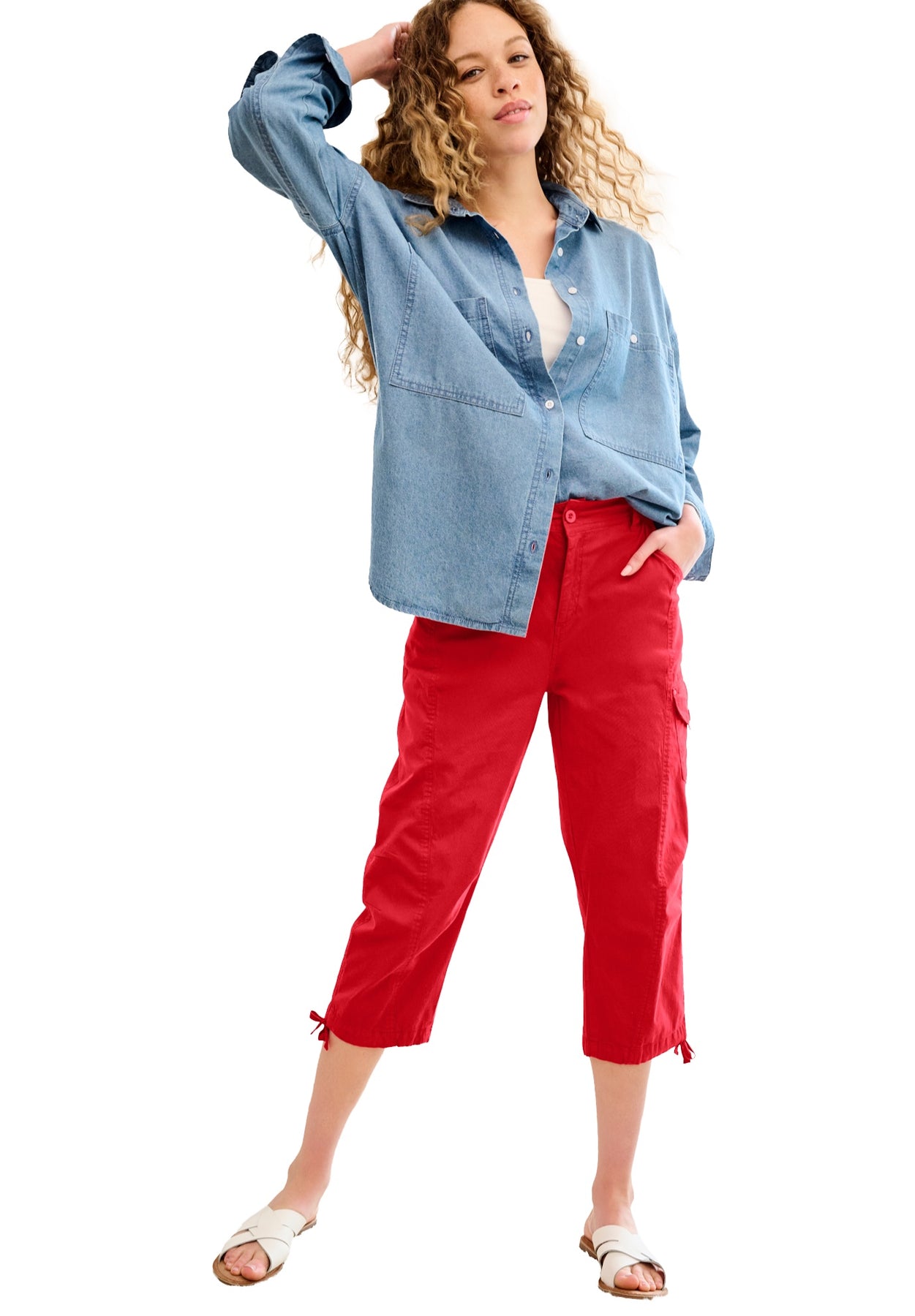 On trend and on point, these stretch cargo capris are crafted from our cotton. They have a comfortable fit with a flattering cropped cut and feminine side ties, perfect for a weekend-casual look. Pair them with your favorite sneakers and a classic tee.