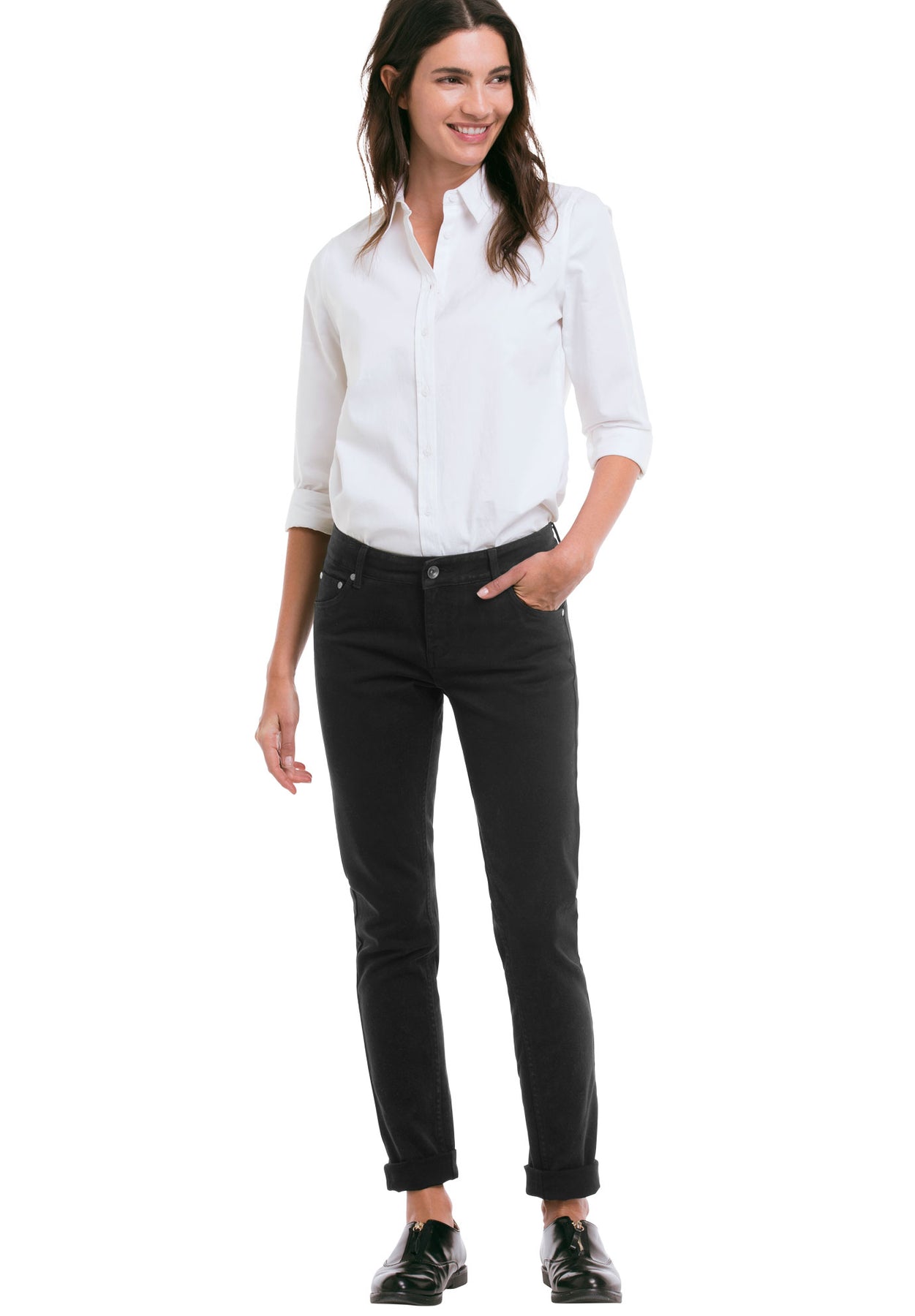 Stretch jeans with a slim straight leg. Non-elastic waistband with belt loops. Zipper/button fly. 3 front pockets and 2 back pockets with topstitching and rivets. Textured whiskering detail added under front pockets and above hem near ankle